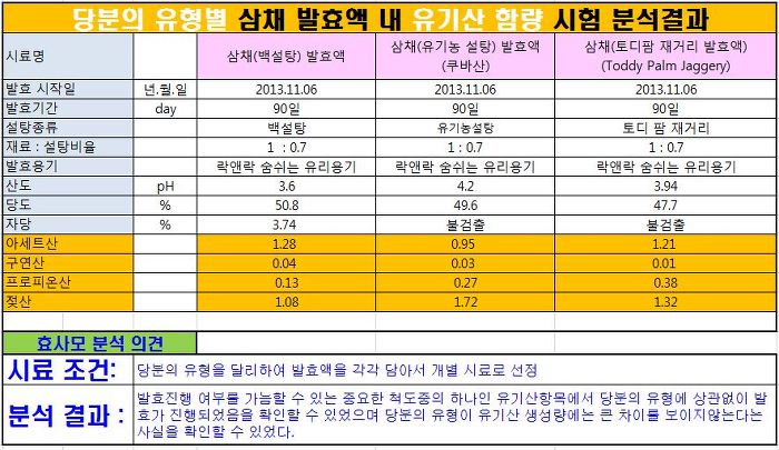 발효액이 발효식품의 일부로 당당히 인정받을수밖에 없는 명백한 입증 자료중의 하나가 바로 발효액속에 유기산함량 유무라고 할수있습니다. 시험 결과에서 확인한 바와 같이 당분의 종류와 상관없이 모든 시료에서 발효과정을 통해서만 생성되는 유기산이 검출되었음을 확인할수 있습니다.