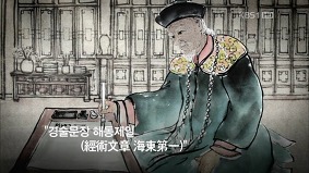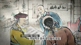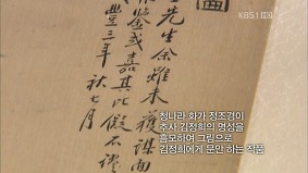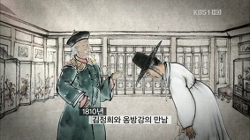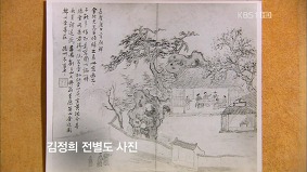 당당한 모습의 김정희와 작은 모습으로 인사하는 정조경. 당시 정조경은 김정희보다 한 살이 많았다. 그리고 둘은 만난 적조차 없다. 만난 적도 없는 청나라 문인이 극도로 존경한 김정희. 어떻게 이런 명성을 얻었을까? 추사가 말년을 보냈던 경기도 과천시 추사 연구회. 이곳에서 그 실마리를 찾을 있었다. 원본은 사라지고 흑백사진 한 장으로만 남은 그림 한 점. 그림은 잔치 장면을 담고 있다. 그런데 그림 속 글에 김정희의 이름이 나온다. 김정희가 중국을 간 것이다.