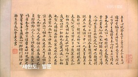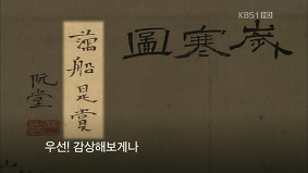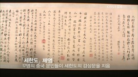 한 폭의 두루마기다. 예상과 달리 아주 길었다. 조심스레 펼쳐 나가자 먼저 제품의 제목과 제품의 소장 내력에 대한 설명이 보인다. 작품이 만들어진지 70년 후인 1914년에 포구됐다. 제목에 이어 드디어 기다리던 본 작품이 나타났다. 국보 제180호 세한도. 추사 김정희의 이상과 혼이 담긴 그림. 그리고 그림에 이어 김정희의 필체로 그림에 대한 발문이 붙어 있다. 대단히 정중하고 단정하게 쓰였다. 발문치고는 꽤 긴 그림. 우리가 보아온 세한도는 그림과 발문. 바로 여기까지다. 그런데 세한도는 이것이 전부가 아니었다. 그림과 발문에 이어 수만은 글이 이어졌다. 세한도를 감상한 사람들이 쓴 감상기인 제영이 붙어 있었다. 이로써 세한도는 그 전체 길이가 무려 14m. 일반적인 예상과는 전혀 다른 모습이었다. 이렇게 세한도 전체의 모습이 처음으로 우리 눈앞에 펼쳐졌다.