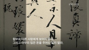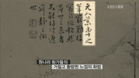 가을이 깊어가던 지난 10월. 엄청난 인파가 한 미술관 앞을 메우고 있었다. 풍속 인물화 대전 전시회장. 조선최고의 화가들이 그린 풍속화와 인물화를 보기 위해 몰려든 인파였다. 신윤복의 미인도를 비롯, 조선의 걸작들이 전시됐다. 이 미술관에는 김정희가 추구했던 그림 세계를 알 수 있는 화첩이 있다. 이 화첩을 평생 간직하며 감상했던 김정희는 친필로 후손들에게 신신당부하고 있다. 왜 김정희는 이 화첩을 그토록 소중히 여겼을까? 김정희는 원나라 때 간결하고 거친 듯 황량한 화법을 지식인이 지향해야 할 최고의 경지로 생각했다.