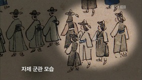 “그 당시에 (김정희가) 자제군관이라는 직책으로 갔기 때문에 자제군관이라는 것은 정사, 부사, 서정관 3사의 가족 중에서 소위 말하면 비서로 가는 거죠. (그런 자격으로) 갔기 때문에 공식적 자리에선 항상 군복을 입어야 되고 그래도 여기도 지금 공식적 자리기 때문에 지금 우리나라의 전립하고 우리 군복을 입은 거죠. 그러니까 이제 그래서 여기서 우리나라 사람은 딱 한명밖에 없다는 것을 알 수 있고 이게 추사라는 걸 알 수 있죠.”