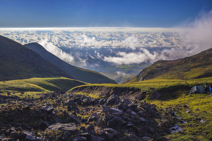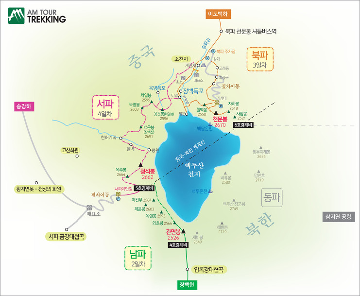 백두산 트레킹 지역은 크게 동, 서, 남, 북파로 나뉜다. 그 중 서파와 북파는 중국에 위치하고, 동파와 남파는 현재 북한쪽에 위치하고 있다. 천지를 중심으로 북파는 험준한 산세를 자랑하며 서파는 완만한 고산지대를 이루고 있다. 서파지역은 광활한 초원지대와 지천에 야생화가 흐드러져 새로운 모습을 보여준다. 새롭게 개방된 북한과 중국쪽에 위치한 트레킹 코스인 남파는 압록강 발원지, 금강대협곡, 4호 경계비 등 트레킹 및 관광 인프라는 부족하나 새롭게 시작되어 트레커들에게 다른 즐거움을 선사한다. 동파는 북한에 위치하기 때문에 현재는 트레킹을 할 수 없다.