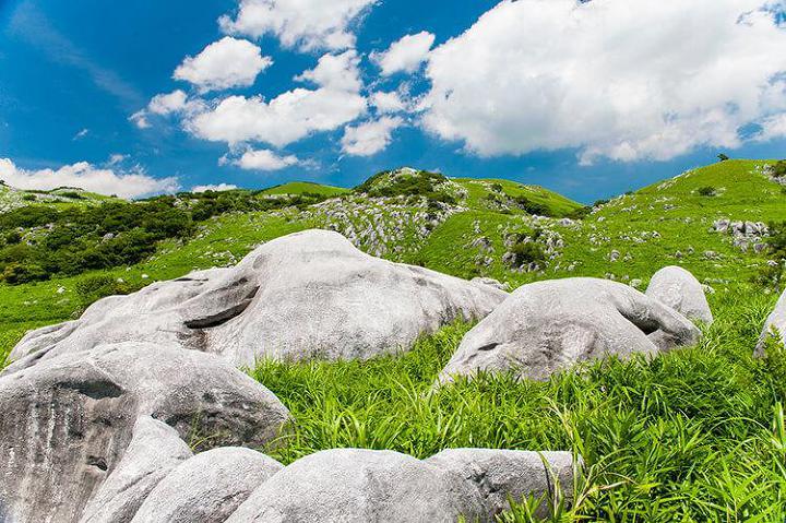 큐슈 최대의 카르스트(석회암) 지대로, 남북 약 6 km, 동서 2 km의 완만한 고원 지대입니다. 천연기념물로 지정되어 있는 카르스트 지대에는 초원에 흰 석회암들이 점재하고 있는데, 그 모습이 마치 초원에서 뛰어 노는 양떼들처럼 보여 「양군원(요우군바루)」이라고도 불립니다. 이러한 경치를 즐길 수 있을 뿐만 아니라 지하에 있는 석회 동굴에 들어가 탐험의 기분을 맛볼 수도 있습니다.