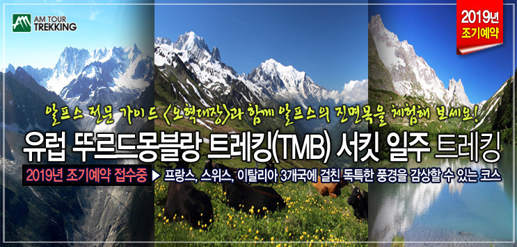 2018년도에도 100여명의 TMB 트레킹 진행으로 축적된 노하우를 바탕으로 2019년에는 가성비 대비 최고의 품위 있는 알프스 트레킹을 <AM트레킹>과 함께하세요. 지금부터 2019년 조기예약으로 더욱 행복한 알프스 트레킹을 준비하세요...