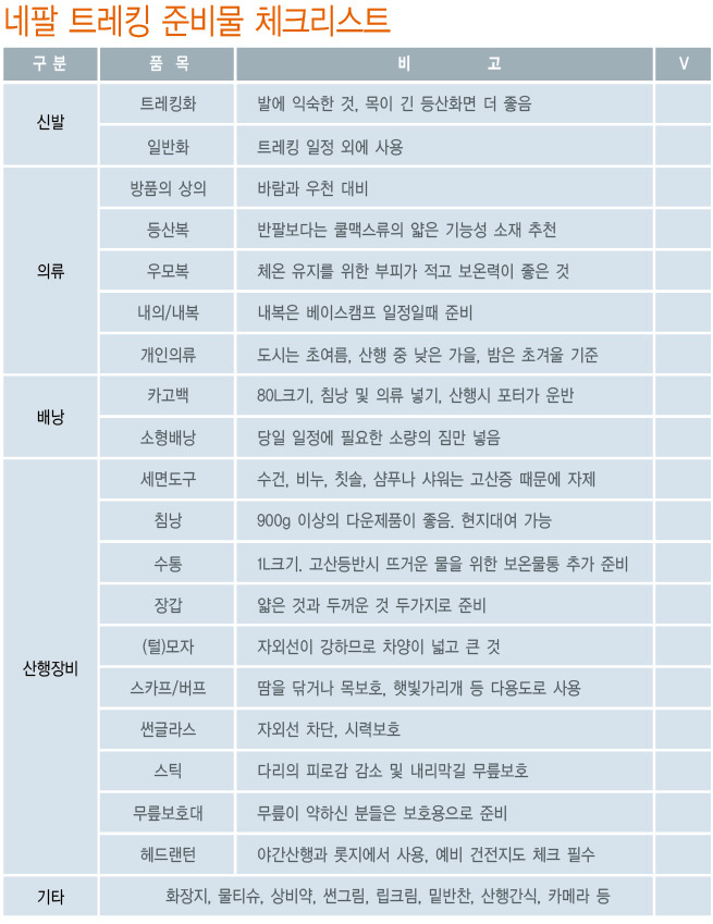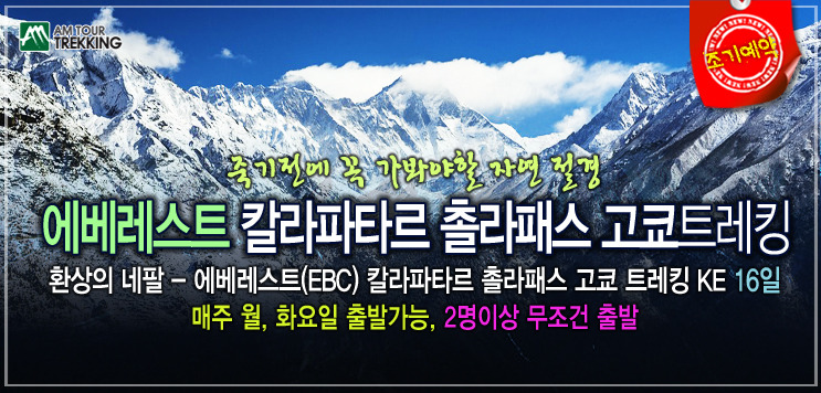 | 포함 내역 | ■ 국제선 및 현지 국내선(카투만두/루크라/카투만두) 항공료 및 택스, ■ 국제선 유류할증료(9월 현재 유류할증료 없음) ■ 전 일정 호텔&롯지(2인1실, 3인1실 사용시 간이베드 제공), 전 일정 일정상 명시된 식사, 전 일정 입장료, ■ 전 일정 전용차량, 카트만두-루크라-카트만두 구간 국내선 및 택스, ■ 한국어 구사 현지인 트레킹 가이드 제공 ■ 카투만두-루크라-카투만두 왕복 항공권 및 택스 (기상 악화로 결항 시 ABC등 대체 일정 진행/차액 환불) ■ 제 2일차(중식) ~ 제 14일차(조식) 네팔인 한식 요리사 및 현지조달 부식재료 등, ■ 트레킹 기간 2~3인 1포터 및 헬퍼 제공, ■ 1인당 1일 1리터 물(온수) 제공, 트레킹 일정동안 1인 1침낭 제공 ■ TIMS CARD및 산림보호비(여권용 칼라 사진 및 여권 칼라 사본 출발 1주일 전까지 제출) ■ 트레킹 일정동안 1인 1침낭 제공 | 불포함 내역 | ▣ 네팔 도착 비자비 : $25/인(사진3매/여권) 불포함 ※준비서류※ - 유효기간 6개월 이상 남아 있는 여권 - 여권용 칼라 사진1매 - 비자신청서와 입국 신고서 ▣ 독실 사용 시 추가요금 ( 35만원 / 전일정) ▣ 팁 - 트레킹 가이드 포터 팁 $130/1인 ※출발 확정 시 신청 선착순, 남녀 성비에 따라 독실이 발생될 수 있습니다.