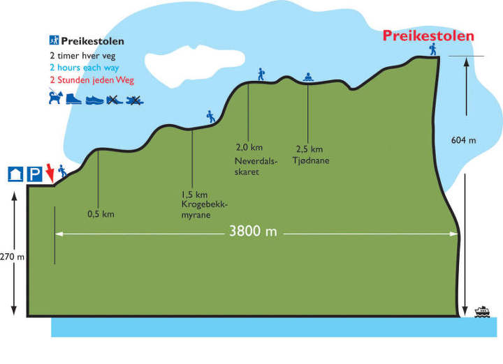 프레이케스톨렌 노르웨이 3대 트레킹 코스 중 가장 많은 관광객들이 방문하는 곳으로 등반로가 잘 정비되어 있고, 쉬운편이다. 코스 끝에 놓여있는 가로 및 세로 25m, 정사각형 모양의 평평한 바위가 설교단 같이 생겨서 붙여진 이름이다. 4월에서 10월 까지 등반 가능하며 겨울에는 가이드와 등반하는 것이 안전하다.