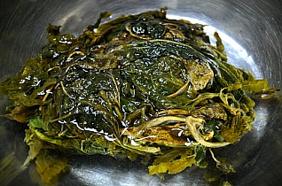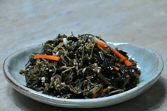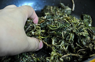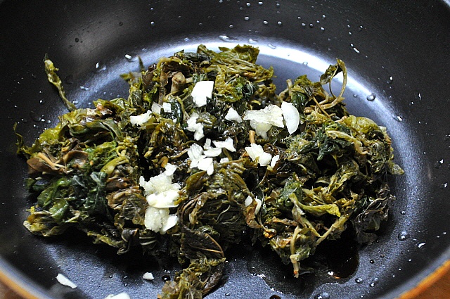 [재료] 뽕잎나물(말렸던것) 삶은것 100그램, 집간장 3분의2 숟가락~1숟가락, 다진 1쪽 다져서,