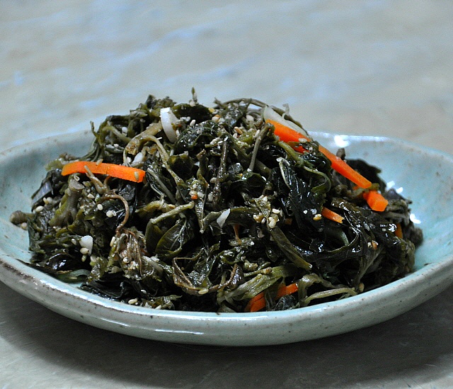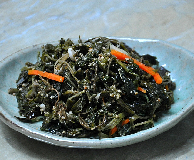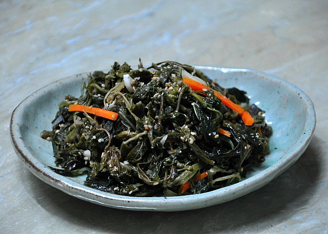 삼삼한 간으로.. 맛있는 뽕잎 묵나물이 요래 한접시가 만들어 졌습니다.