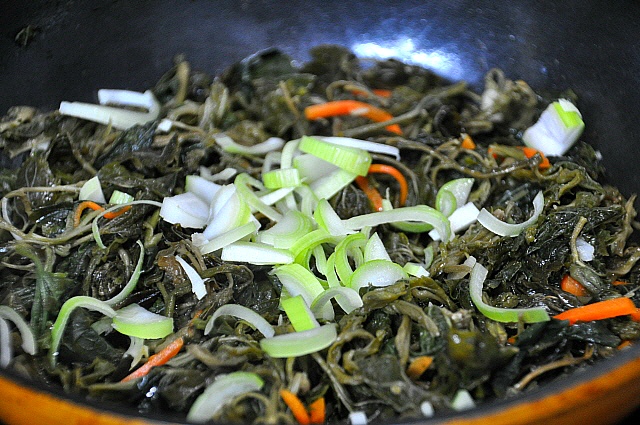 여기서 나물이 좀 말랐다 싶으면.., 육수를 추가하여 부드럽게 만들어 줍니다.