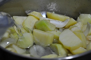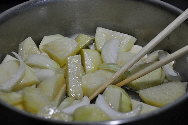 냄비에 들기름을 넣고..감자, 양파, 마늘을 달달달 볶아줍니다.