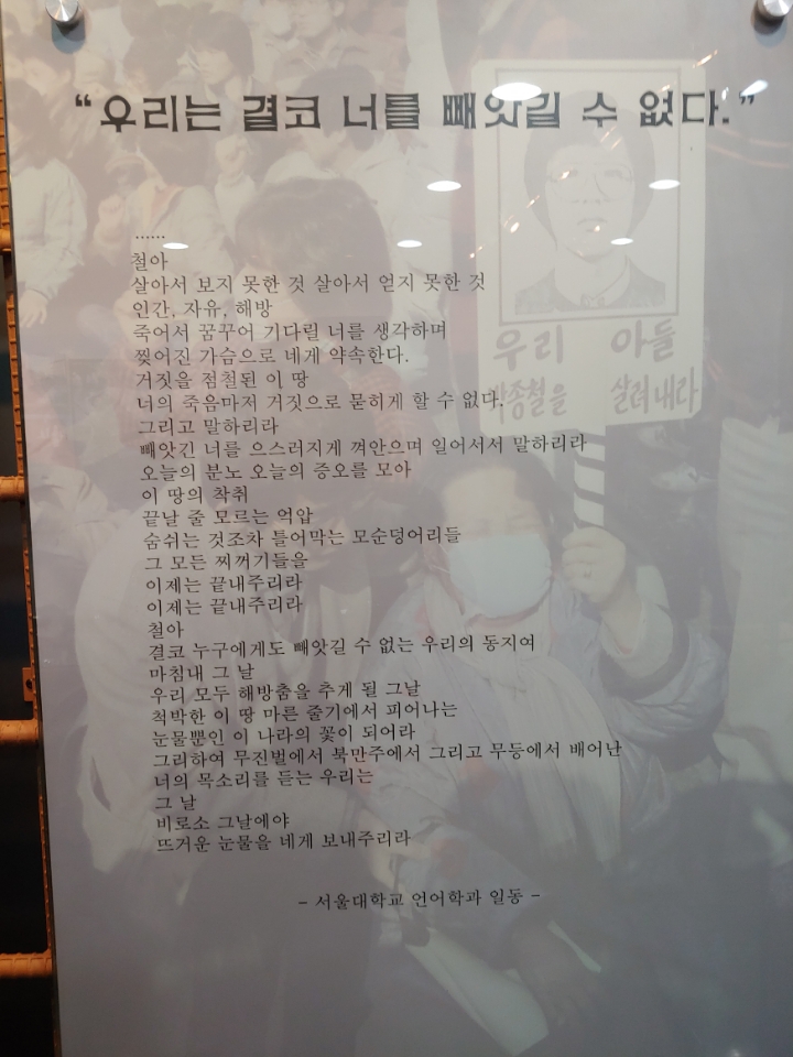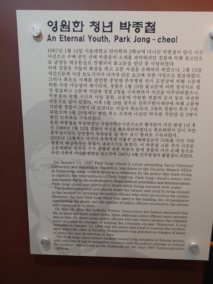 다크 투어리즘 (구 남영동 대공분실 현 민주인권기념관 )을 다녀와서...박종철 열사 전시실 층. (4) 작성자풍문으로 들었어|작성시간19.11.14|조회수31 목록 댓글 0 글자크기 작게가 글자크기 크게가 ㅠㅠ 동영상[1987] 박종철 고문치사 사건의 진상을 폭로하는 정의구현 사제단여기를 눌러 링크를 확인하세요www.youtube.com 다음검색 현재 게시글 추가 기능 열기 북마크 공유하기 신고 센터로 신고 댓글 댓글 0 댓글쓰기 답글쓰기 댓글 리스트