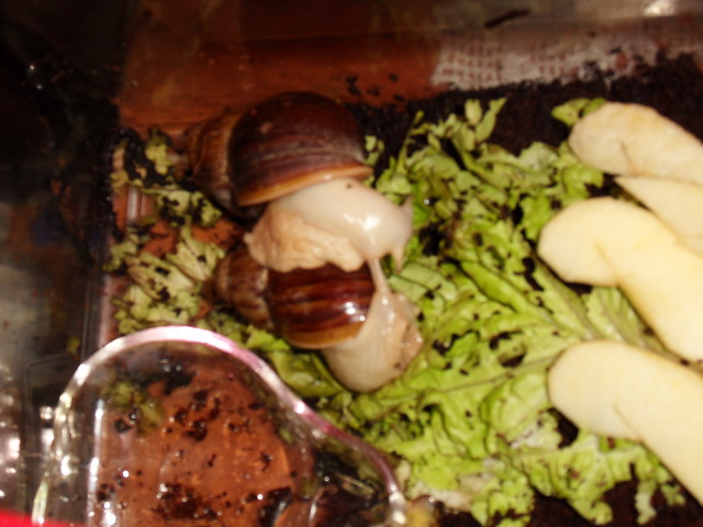 며칠 전에 140마리 정도 분양을 하고 16마리만 남겨 놓았습니다. 그리고 한 동안 달팽이 키우기가 여유롭겠구나 하고 생각하고 있었는데 오늘 어미 두 마리가 교미하는 장면이 목격되었습니다. 한 참을 지켜 보았는데 더듬이 밑 쪽에 몸 속에서 생식기 같은 것이 나온 것이었습니다. 교미가 끝난 다음에는 몸 속으로 쏙 들어가버리더라구요. 그리고 교미 시에는 한 마리가 상대방에게 생식기를 넣는 방식이었습니다. 제가 볼 때는 정자를 주는 쪽이 생식기가 나오는 것 같았습니다. 이제 기다려보면 교미 후 며칠만에 알을 낳는지 알 수 있겠군요. 안타까운 것은 통이 오래되서 사진이 선명하게 나오지 않았습니다. 그래도 어느 정도 분간은 됩니다.