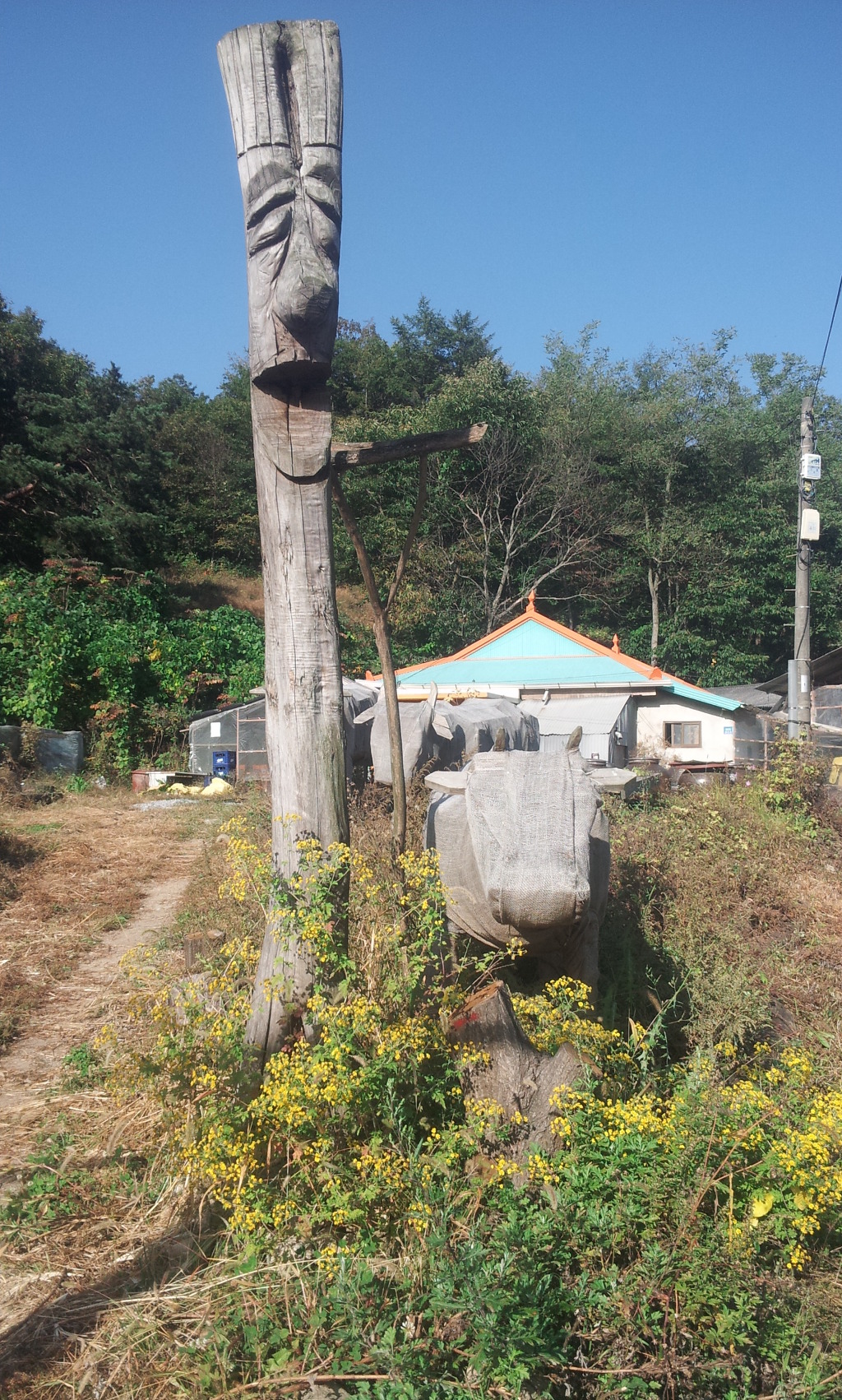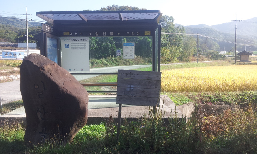 이 곳 정자에서 간혹 마을 분들은 소주 한잔하며 쉬기도 하고 어린이집에 등교하는 아이가 등교 차량을 기다리는 곳이기도 하고 그 아이의 엄마가 어린이 집에서 집으로 오는 아이를 기다리는 곳이기도 하다. 그리고 버섯 농사 지으신 분들은 수확한 버섯 상자를 쌓아 놓고 버섯상자를 싣고 갈 농협 차량을 기다리는 곳이기도 하다.