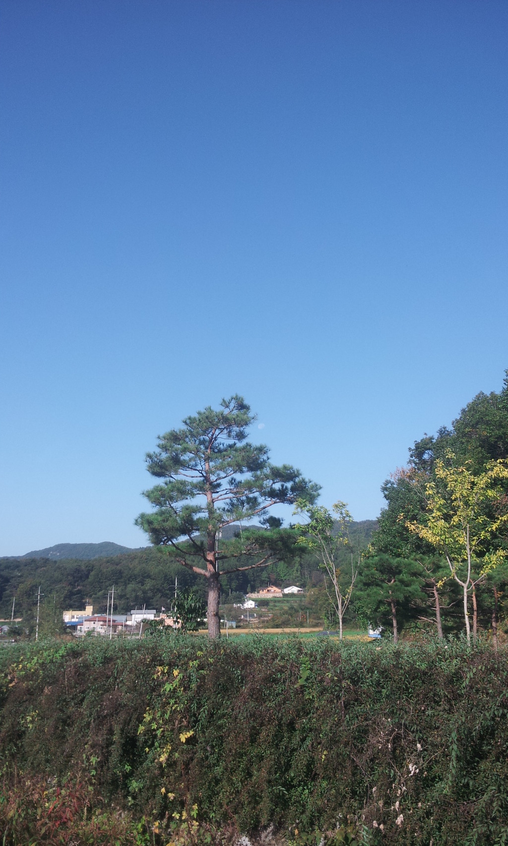 달이 미처 밤하늘과 함께 넘어가지 못하고 쫓아오는 태양을 피해 소나무 가지에 숨었다.