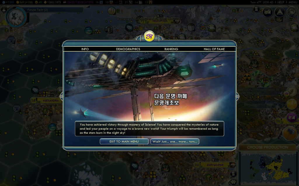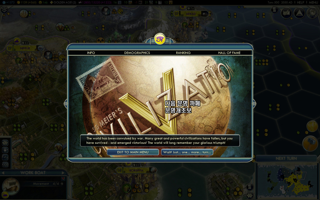 문화적승리로 되는거지만 그전에 이미 타임오바되서 끝나더군요. 한턴만더 게임해서 만들어봤더니 엔딩샷은 안뜨더군요.