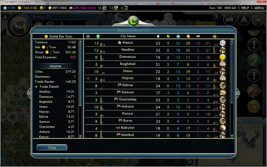 대충 낙타기병을 3이상 보유했다면 더이상 아라비아를 막을 건 없습니다. 이제부터는 근처 가장 가까운 국가를 그냥 까부셔버립시다. 낙타기병으로 원거리 공격을 가하고 남는 기병과 밀리계열 유닛으로 밀어 붙이면 당 시대에 이 조합을 막을 국가는 없습니다. 그 후 도시를 점령하고나서 도시를 도로를 연결해주어서 유지비를 얻어냅니다. (퍼펫이어도 도로 교역은 적용됩니다.)