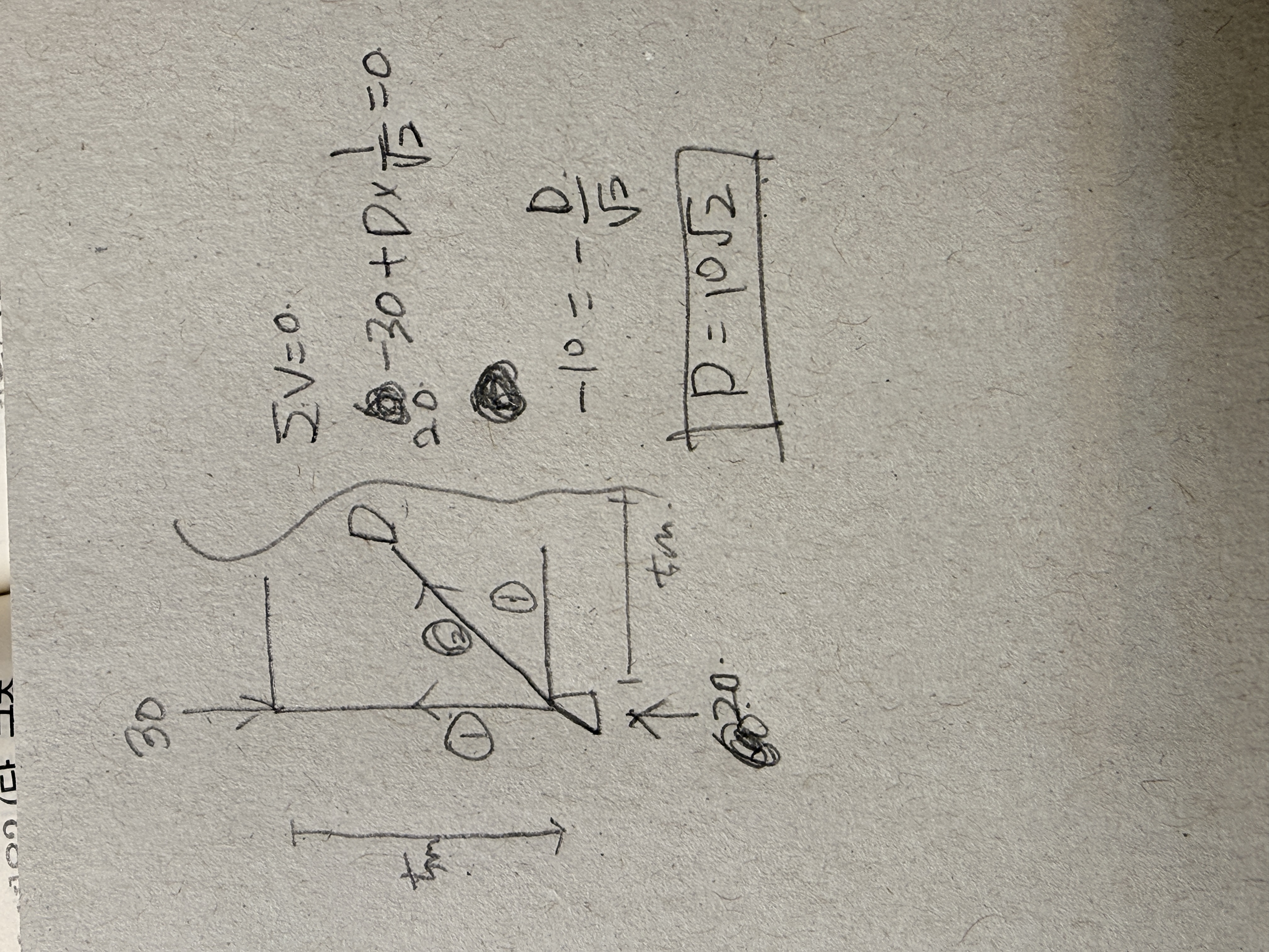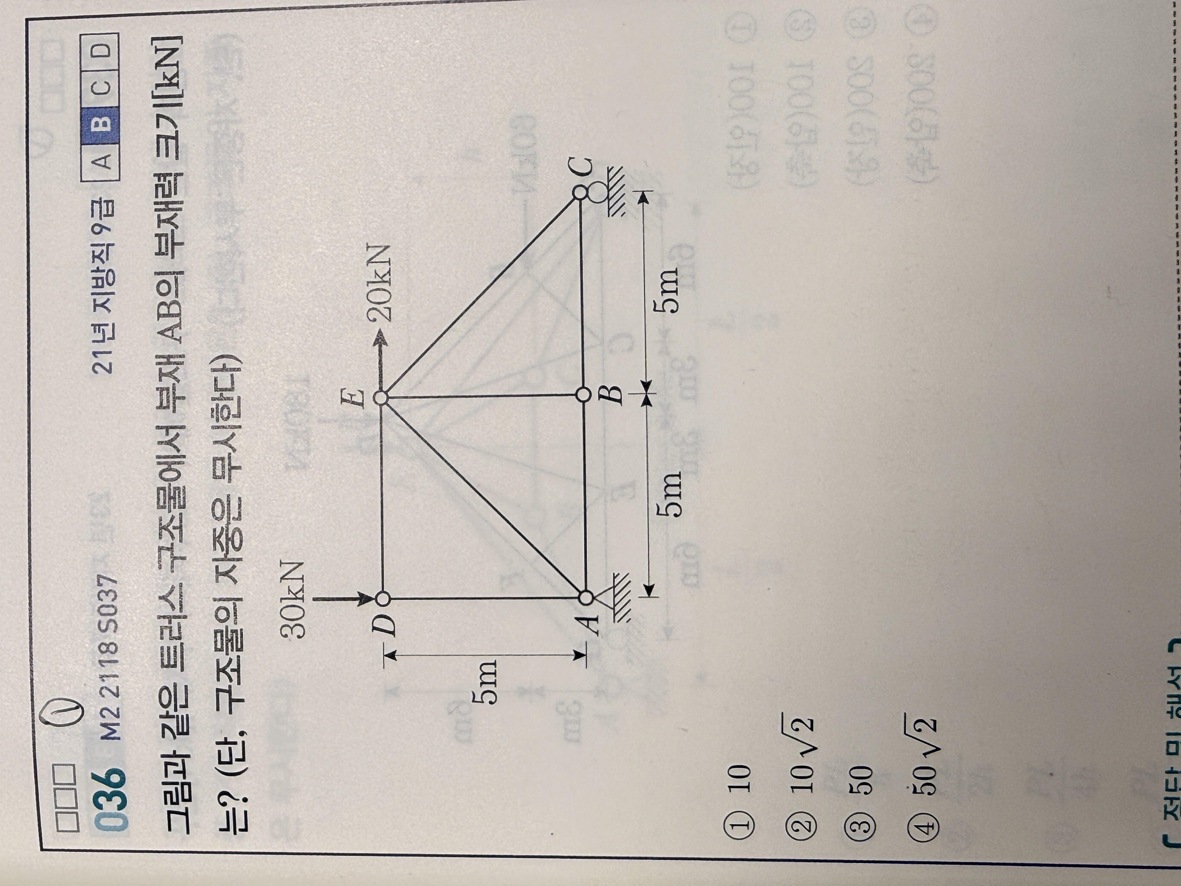 시그마V=0 으로 왼쪽 트러스 절단해서 부재력D(=AB부재) 구해봤는데 답이 다르게 나옵니다 ㅠ 어디가 잘못된걸까요 ㅜ