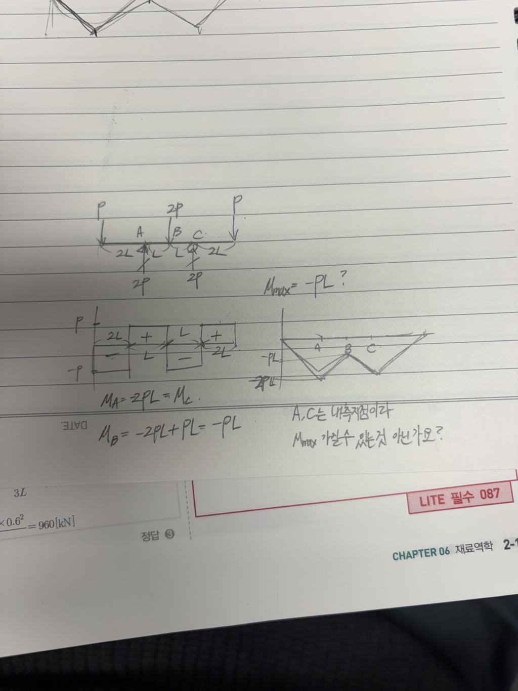 SFD와 BMD도 그려보았을 때 Mmax는 -2PL 아닌가요?? 어디가 잘못 됐는지 알려주세요!!ㅠㅠ
