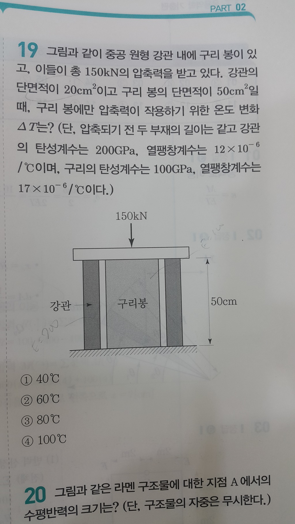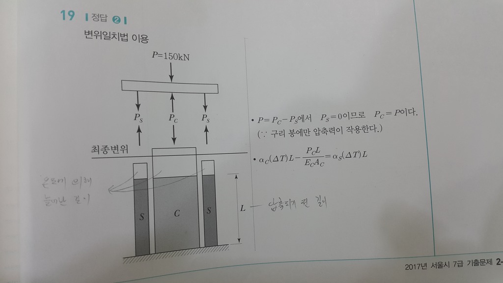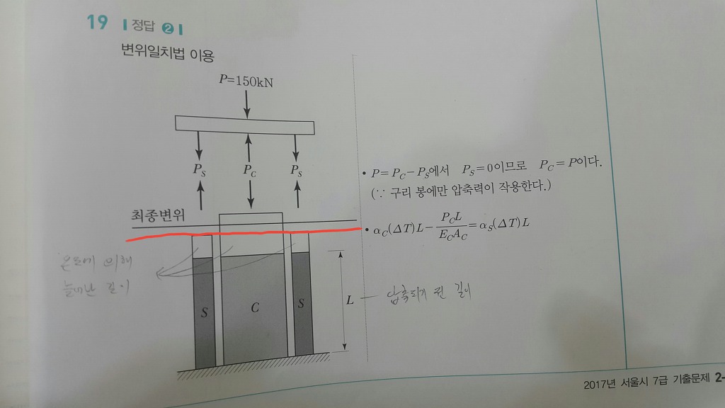 제 생각엔 처음에 150kN으로 압축된 상태에서 온도가 증가하면서 Ps가 -값을 갖다가 0이 되는 순간 구리 봉에만 압축력이 작용하기 때문에 해설 그림에서 최종 변위 라인이
