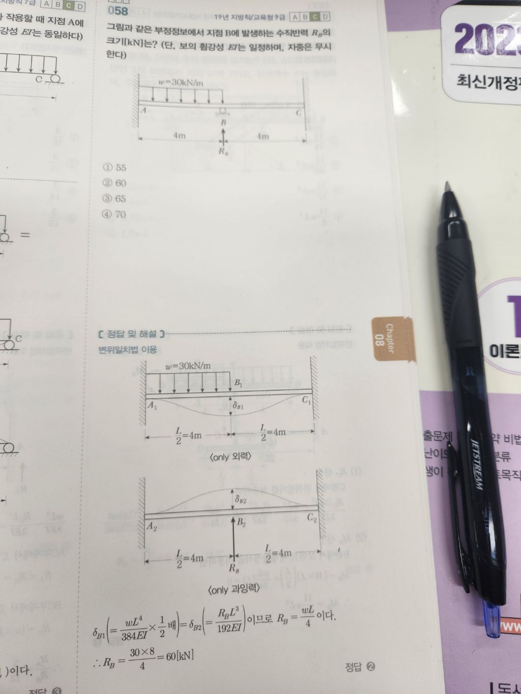 기출노트 p411 58번 해설강의를 보면 Rb를 과잉력으로 보고 양단고정에서 외력에 의해 발생하는 처짐과 과잉력에 의해 발생한 처짐이 같다고 푸셨던데