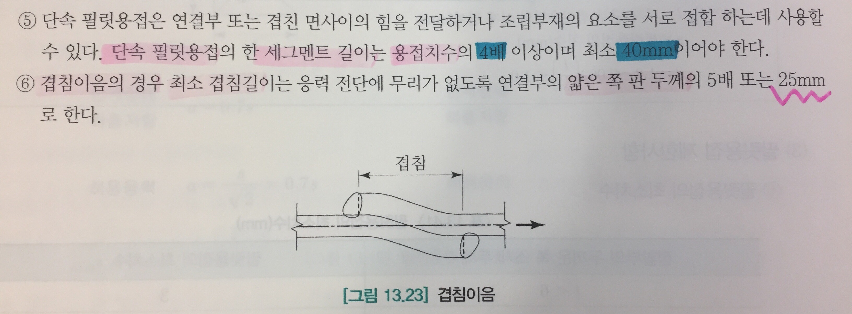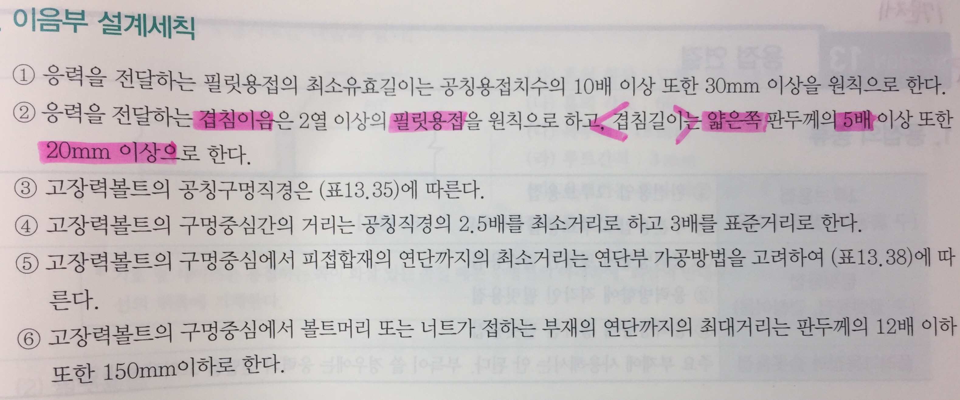 “응력을 전달하는 겹침이음은 2열 이상의 필릿용접을 원칙으로 하고, 겹침길이는 얇은쪽 판두께의 ‘5배’ 이상 또한 ‘20mm’이상으로 한다”