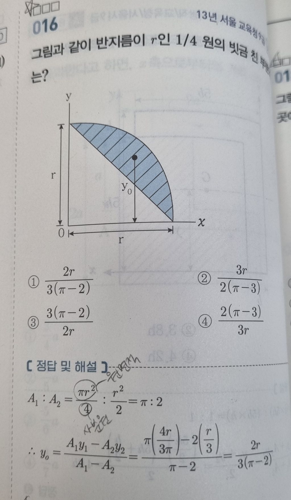 원의면적공식은 파이r의제곱으로 알고있었는ㄴ데 책에선 파이r제곱/4라고 써있어서 그렇게 문제푸는중에 기출풀이인강을 듣다 의문이 생겨서요 16번 문제 푸실때는 4로 나누는이유가 4분원이라서 4로 나눈거라고 되어있는데 이론책에 써있는 원의단면적과 차이가 뭘까요,,?