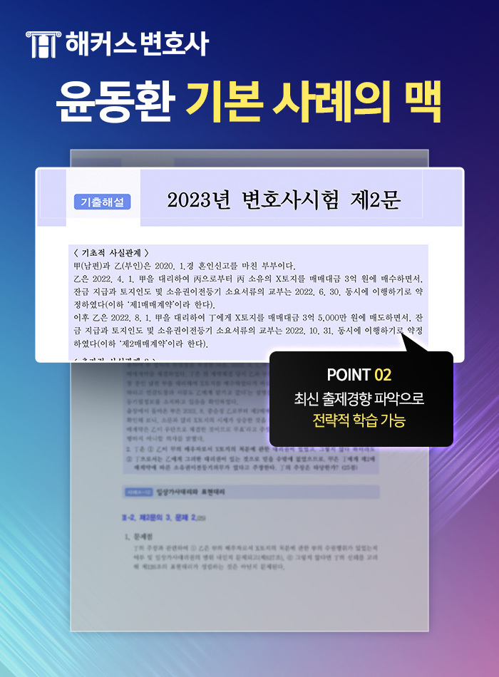 변호사시험 및 각종 국가고시에 자주 출제되는 사례를 엄선하여, 최신 출제경향 파악 및 꼭 필요한 내용만 빠르게 학습 가능합니다.