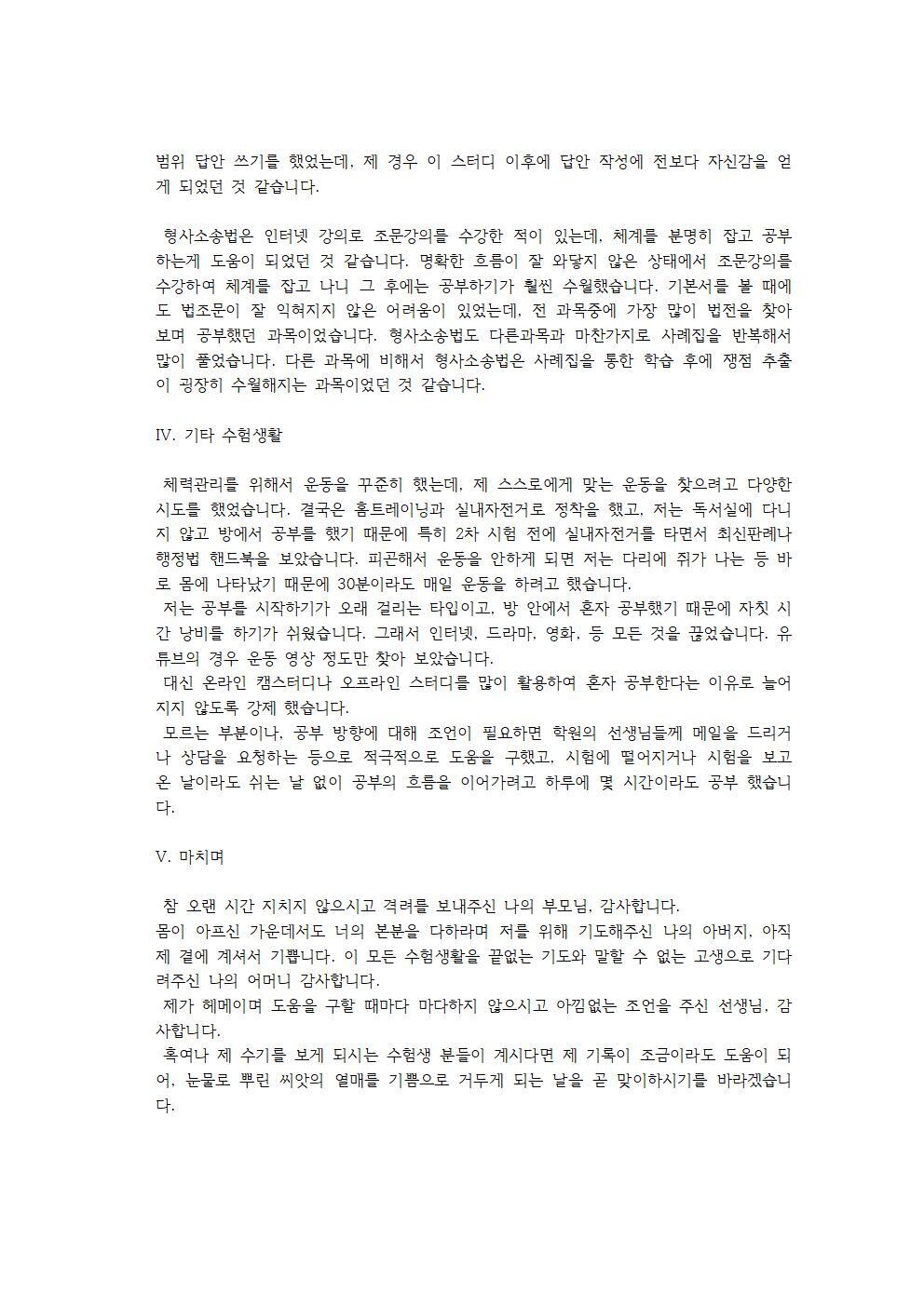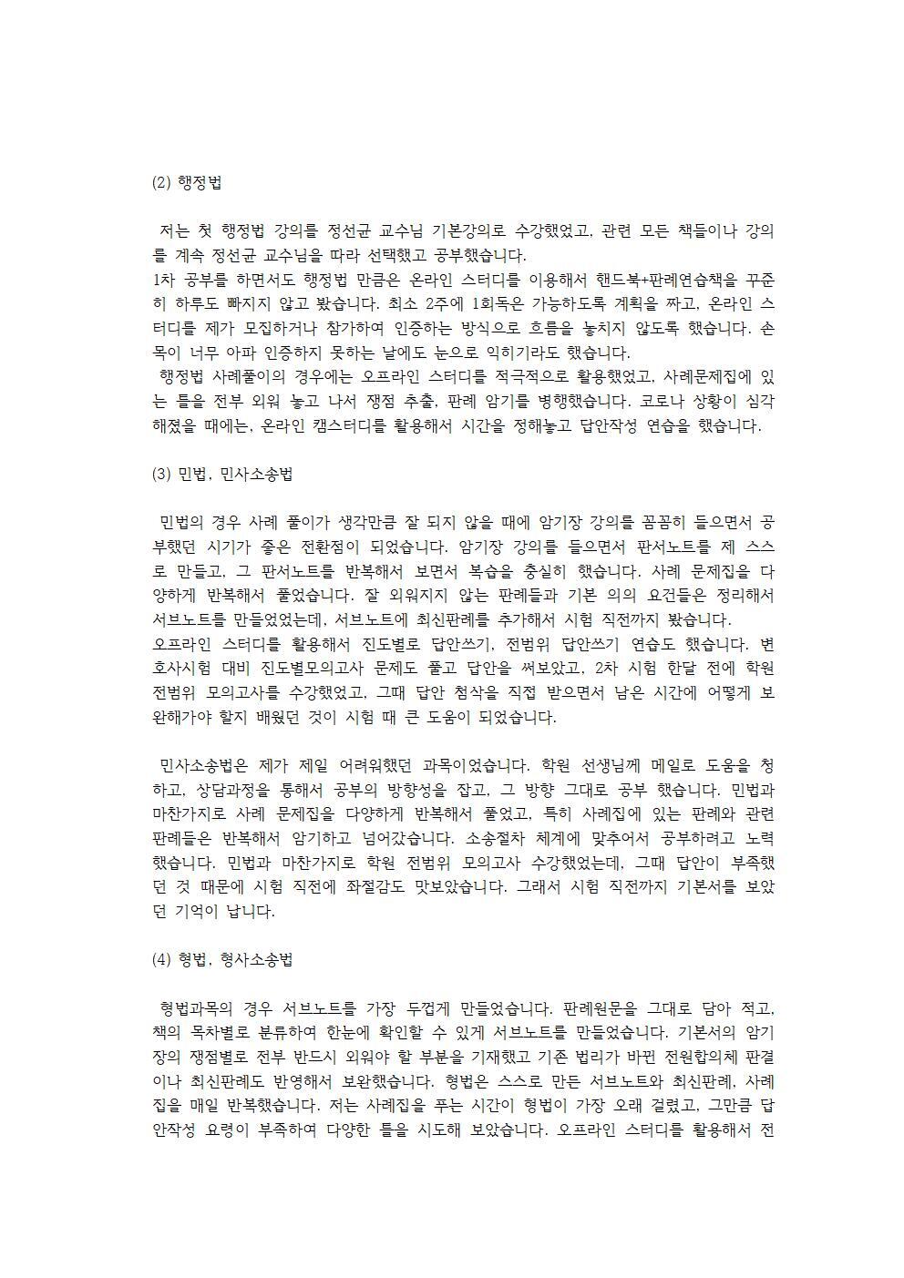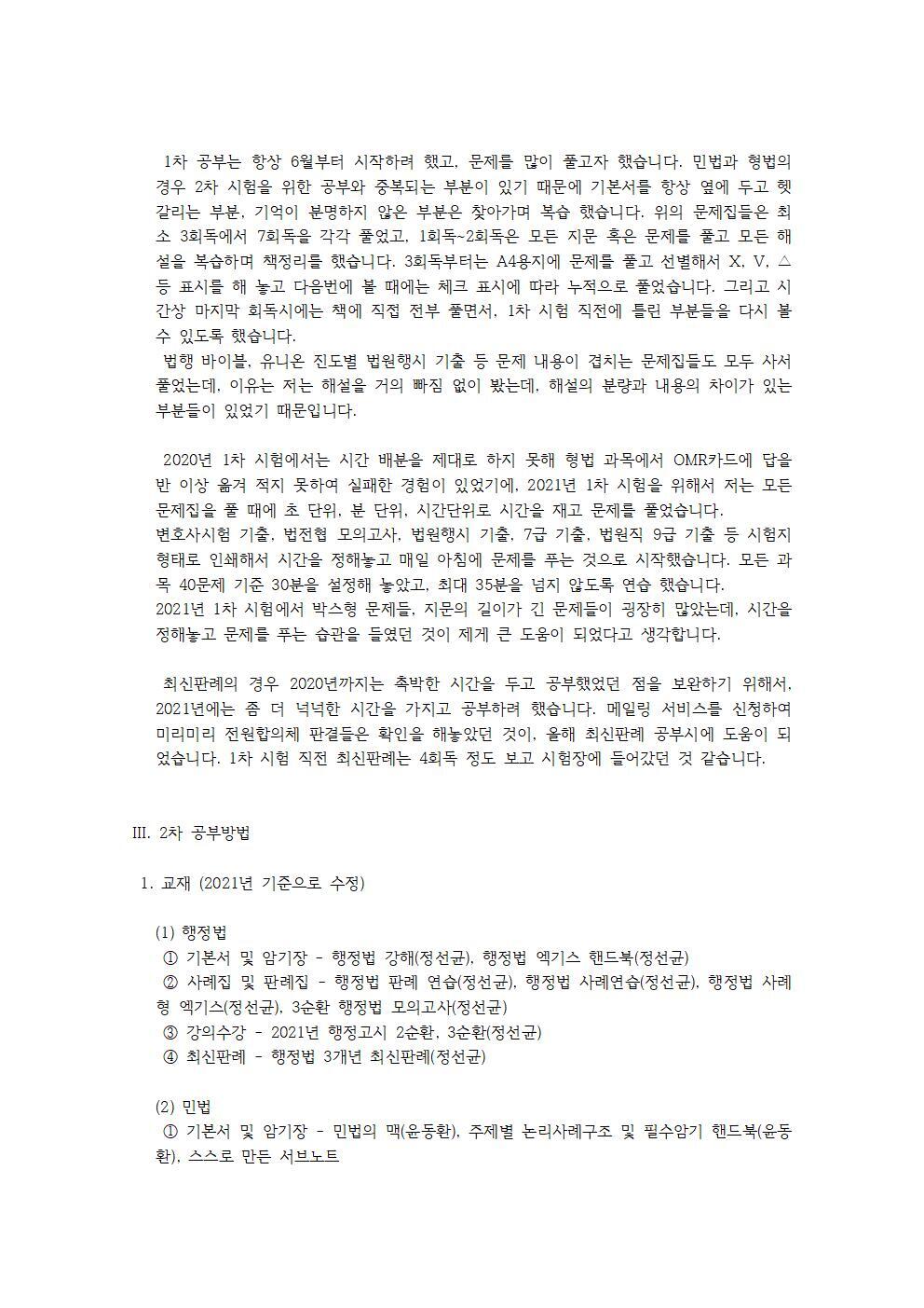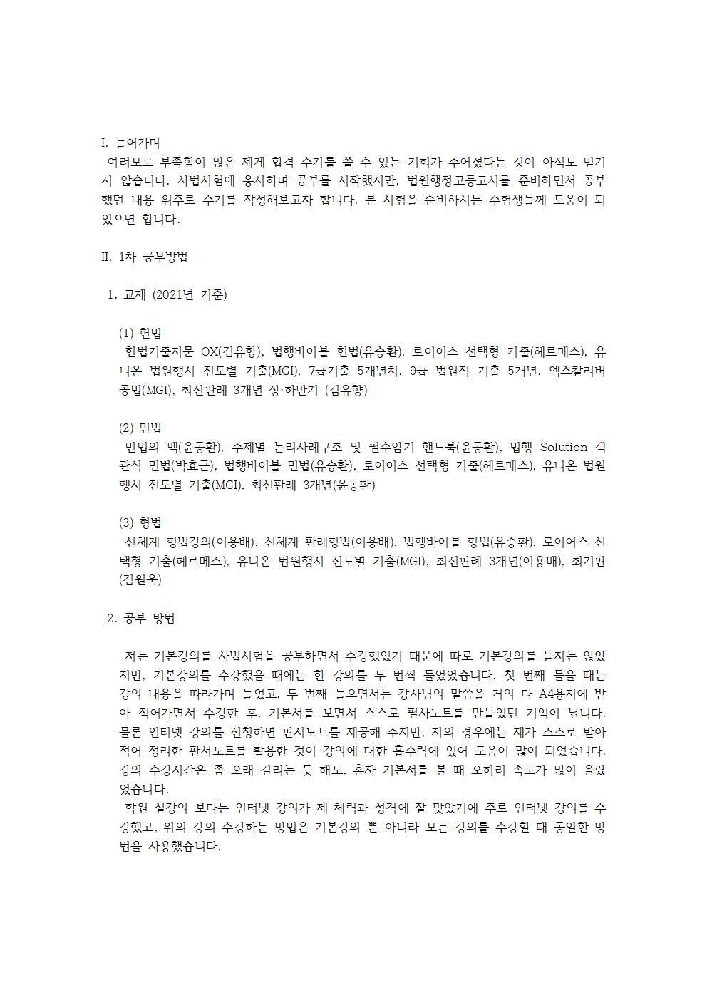 21년 법원행정고시 최종합격수기 작성자윤동환|작성시간22.01.04|조회수5,333 목록 댓글 1 글자크기 작게가 글자크기 크게가 다음검색 현재 게시글 추가 기능 열기 북마크 공유하기 신고 센터로 신고 댓글 댓글 1 댓글쓰기 답글쓰기 댓글 리스트 작성자윤동환 작성자 본인 여부 작성자 | 작성시간 22.01.04 제 학습조교도 하시고 저와 함께 몇년동안 잘 훈련받고 이번에 법원행정고시에 최종합격한 학생의 합격수기입니다. 공부계획을 세우는데 도움이 되시길 바랍니다. ^^ 댓글 전체보기
