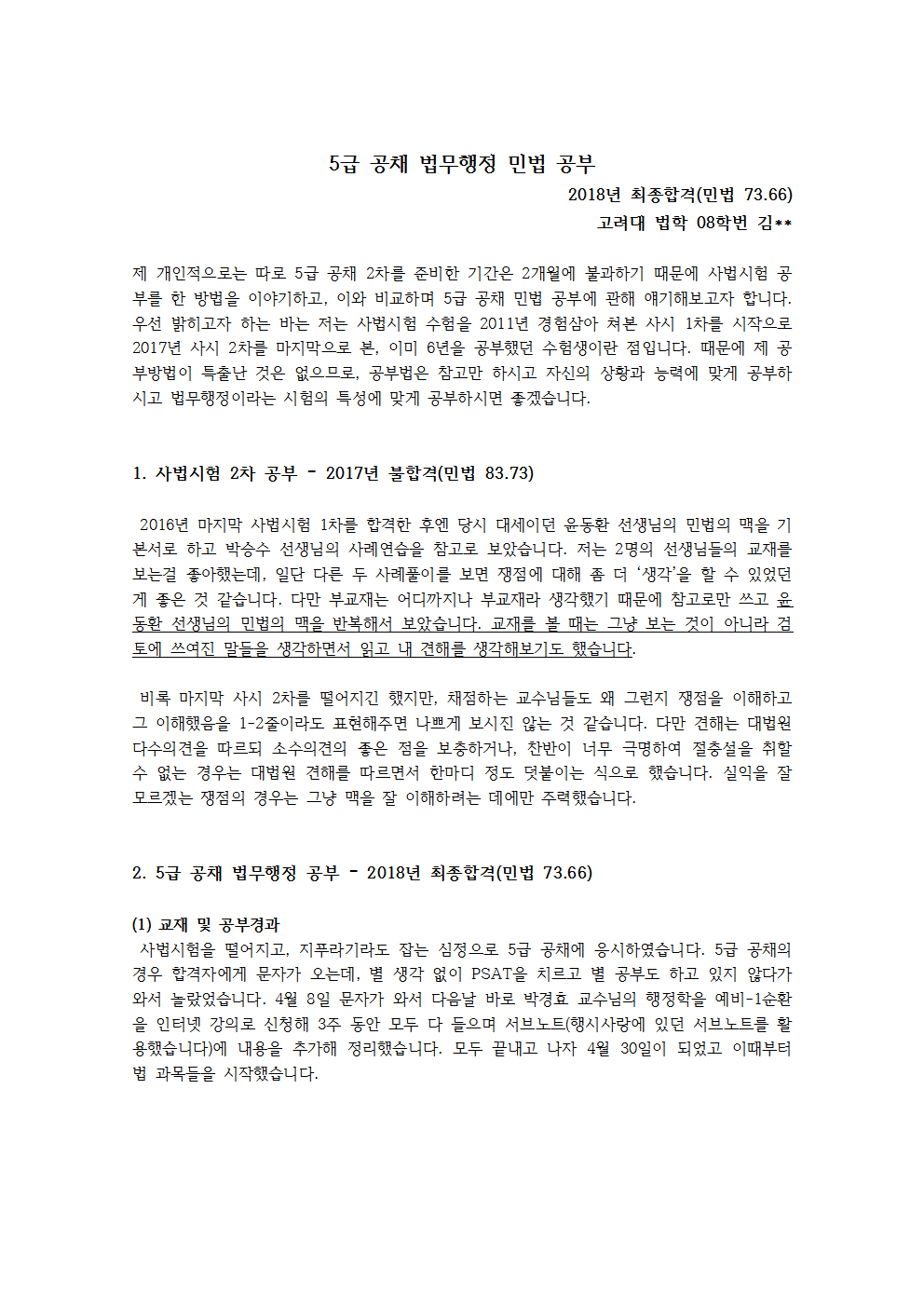 작성자윤동환 작성자 본인 여부 작성자 작성시간 18.12.05 2018년 법무행정에서 민법 73.66을 획득하여 우수한 성적으로 합격한 수험생이 저의 부탁으로 민법 합격수기를 써 주셨습니다. 공부에 도움이 되시길 바라구요~