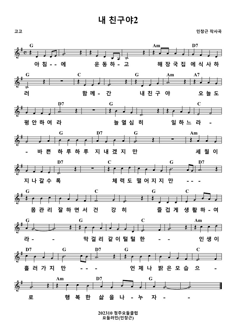 #내친구야2 #친구 #아침엔운동하고 #해장국집 #해장국집에 #식사하러함께간 #오늘도평안하여라 #늘열심히일하느라 #바쁜하루하루지내겠지만 #세월이지나갈수록 #체력도떨어지지만 #몸관리잘하면서 #건강히 #즐겁게생활하여라 #막걸리같이털털한 #막걸리 #막걸리같이 #털털한 #인생이흘러가지만 #언제나밝은모습으로 #행복한삶을나누자 #인생 #행복 #밝은모습 #가요 #새가요 #찬양 #새찬양 #아이들찬양 #어린이찬양 #창작곡 #연주곡 #요들러민 #민창근 #충만교회 #청주충만교회 #용암동 #노래많이만드는 #노래많이만드는요들러민 #노래많이만드는사람 #청주