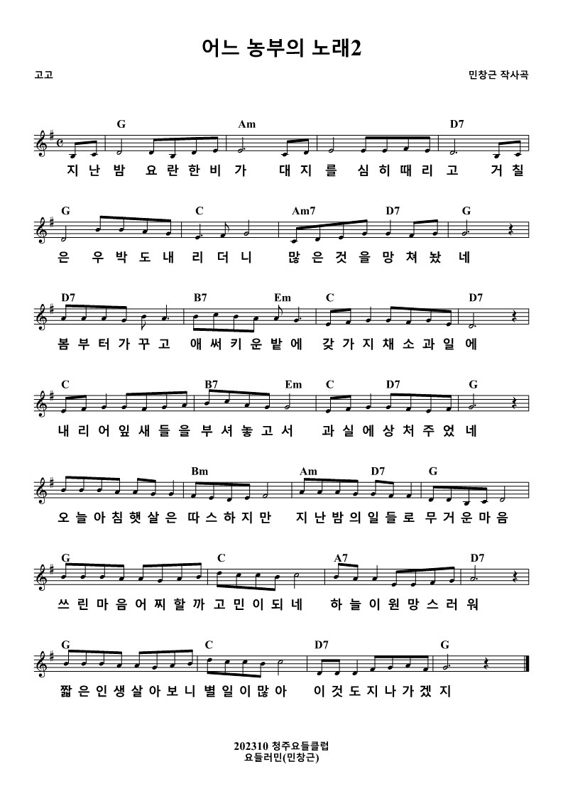 #어느농부의노래2 #농부의노래 #지난밤 #요란한비 #대지를심히때리고 #거칠은우박도내리더니 #우박 #많은것을망쳐놨네 #봄부터 #가꾸고애써키운밭 #갖가지채소과일에내리어 #잎새들을부셔놓고서 #과실에상처주었네 #오늘아침햇살 #따스하지만 #지난밤의일들로 #무거운마음 #쓰린마음어찌할까 #고민이되네 #하늘이원망스러워 #짧은인생살다보니 #별일이많아 #이것도지나가겠지 #가요 #새가요 #찬양 #새찬양 #아이들찬양 #어린이찬양 #창작곡 #연주곡 #요들러민 #민창근 #충만교회 #청주충만교회 #용암동 #노래많이만드는 #노래많이만드는요들러민 #노래많이만드는사람 #청주