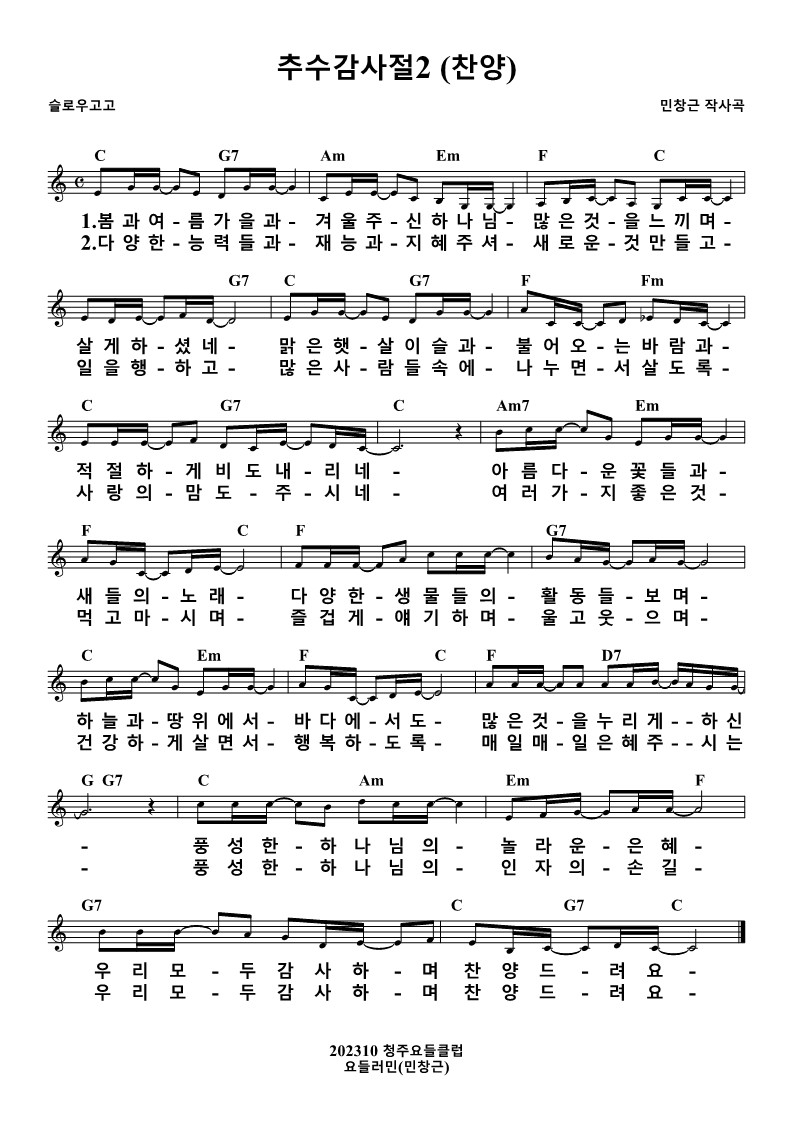 풍 성 한 - 하 나 님 의 - 인 자 의 - 손 길 - 우 리 모 - 두 감 사 하 - 며 찬 양 드 - 려 요 -