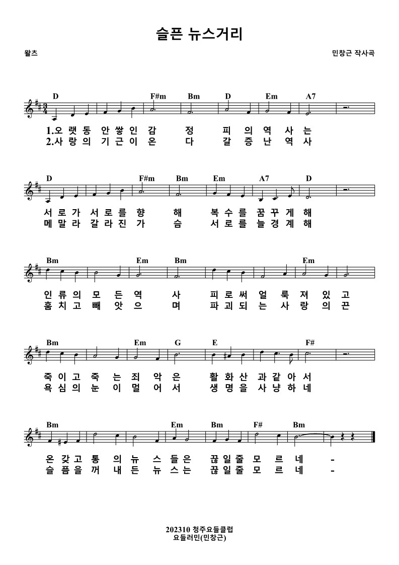 #슬픈뉴스거리 #오랫동안쌓인감정 #피의역사 #서로가서로를향해 #복수 #복수를꿈꾸게해 #인류의모든역사 #피로써얼룩져있고 #죽이고죽는죄악 #활화산과같아서 #활화산 #온갖고통의뉴스 #끊일줄모르네 #사랑의기근 #사랑 #기근 #기근이온다 #갈증난역사 #메말라갈라진가슴 #서로를늘경계해 #훔치고빼앗으며 #파괴되는사랑의끈 #사랑의끈 #욕심의눈이멀어서 #생명을사냥하네 #슬픔을꺼내든뉴스 #슬픔 #가요 #새가요 #찬양 #새찬양 #아이들찬양 #어린이찬양 #창작곡 #연주곡 #요들러민 #민창근 #충만교회 #청주충만교회 #용암동 #노래많이만드는 #노래많이만드는요들러민 #노래많이만드는사람 #청주