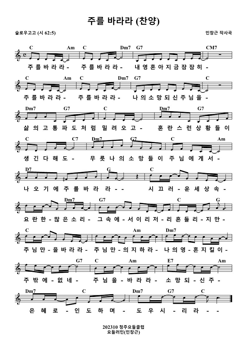 #주를바라라 #시62:5 #내영혼아 #지금잠잠히 #나의소망되신주님을 #소망 #주님 #삶의고통 #파도처럼밀려오고 #혼란스런상황들이생긴다해도 #혼란스런상황 #무릇나의소망들이 #주님에게서나오기에 #시끄러운세상속에 #요란한많은소리 #그속에서이리저리흔들리지만 #주님만을바라라 #주님만의지하라 #나의영혼지킬이 #주밖에없네 #소망되신주 #은혜로인도하며 #도우시리라 #시편62편5절 #가요 #새가요 #찬양 #새찬양 #아이들찬양 #어린이찬양 #창작곡 #연주곡 #요들러민 #민창근 #충만교회 #청주충만교회 #용암동 #노래많이만드는 #노래많이만드는요들러민 #노래많이만드는사람 #청주