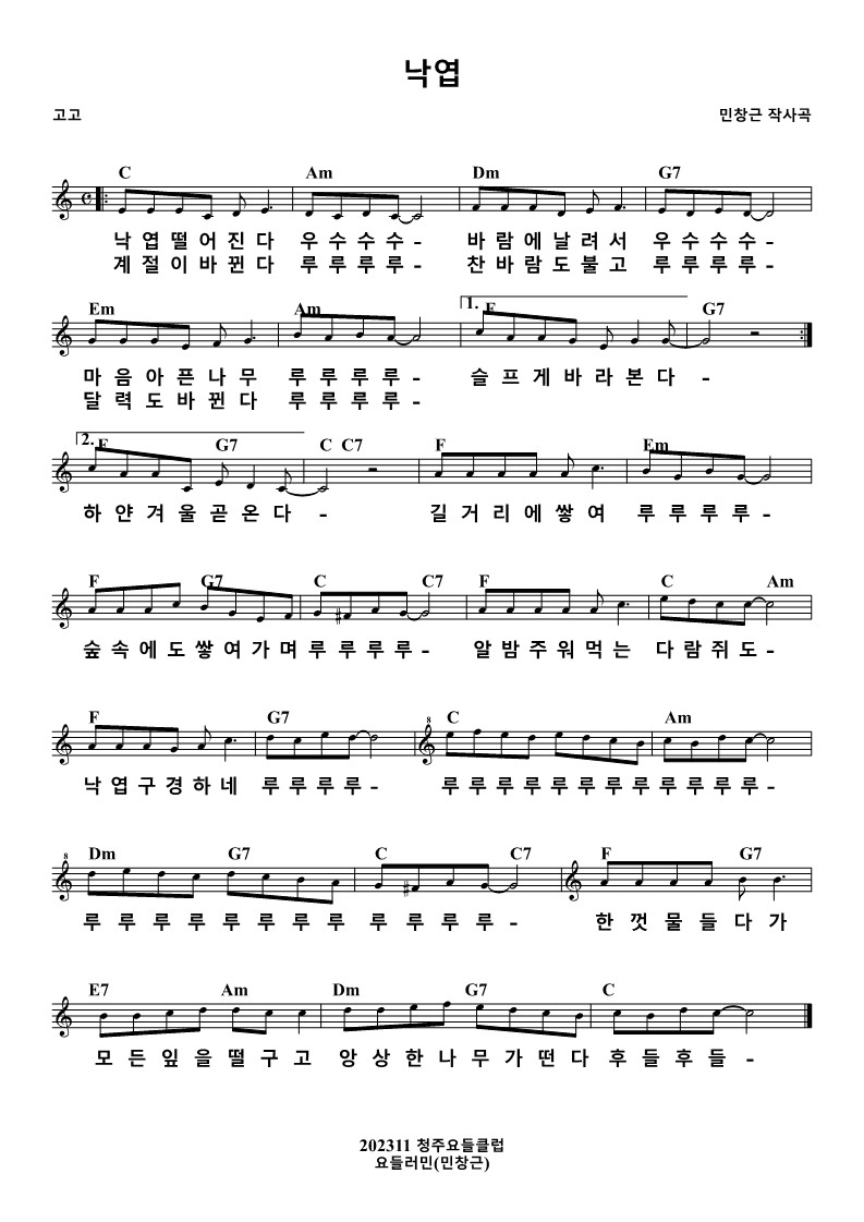 #낙엽 #낙엽떨어진다 #우수수 #낙엽우수수 #바람에날려서 #마음아픈나무 #루루루루 #슬프게바라본다 #계절이바뀐다 #찬바람도불고 #달력도바뀐다 #하얀겨울곧온다 #길거리에쌓여 #루루루루 #숲속에도쌓여가며 #알밤주워먹는 #다람쥐도낙엽구경하네 #다람쥐 #낙엽구경 #알밤 #숲속 #한껏물들다가 #모든잎을떨구고 #앙상한나무가떤다 #후들후들 #가요 #새가요 #찬양 #새찬양 #아이들찬양 #어린이찬양 #창작곡 #연주곡 #요들러민 #민창근 #충만교회 #청주충만교회 #용암동 #노래많이만드는 #노래많이만드는요들러민 #노래많이만드는사람 #청주