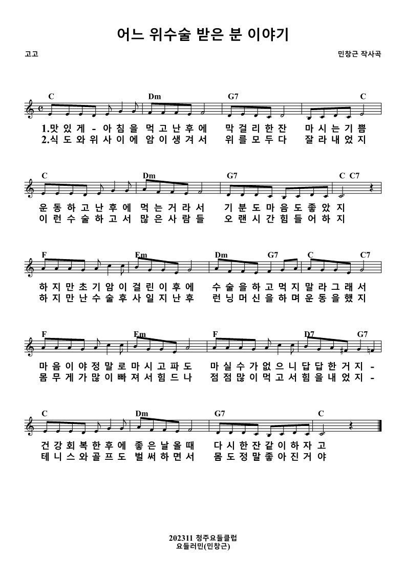 #어느위수술받은분이야기 #맛있게아침을먹고난후에 #막걸리한잔 #마시는기쁨 #운동하고난후에먹는거라서 #기분도마음도좋았지 #초기암이걸린이후에 #수술을하고 #먹지말라 #마음이야정말로마시고파도 #마실수가없으니 #답답한거지 #건강회복한후에 #좋은날올때 #한잔같이하자고 #식도와위사이에암이생겨서 #위를모두다잘라내었지 #위절제수술 #이런수술하고서 #많은사람들 #오랜시간힘들어하지 #수술후사일지난후 #런닝머신 #운동을했지 #운동 #몸무게가많이빠져서 #힘드나 #점점많이먹고서힘을내었지 #테니스 #골프 #벌써하면서 #몸도많이좋아진거야 #환자 #환우 #회복 #가요 #새가요 #찬양 #새찬양 #아이들찬양 #어린이찬양 #창작곡 #연주곡 #요들러민 #민창근 #충만교회 #청주충만교회 #용암동 #노래많이만드는 #노래많이만드는요들러민 #노래많이만드는사람 #청주