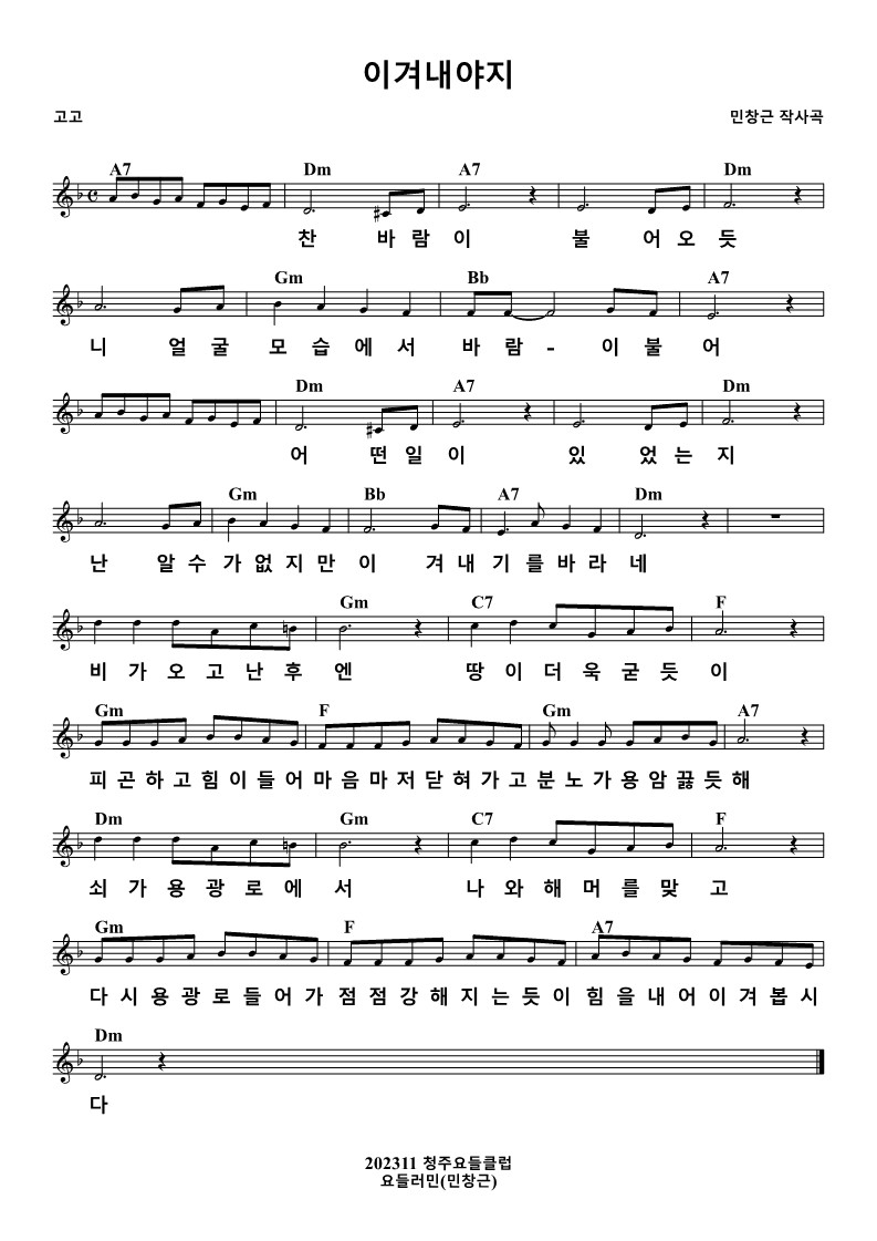 #이겨내야지 #찬바람이불어오듯 #니얼굴모습에서 #바람이불어 #어떤일이있었는지 #난알수가없지만 #이겨내기를바라네 #비가오고난후에 #땅이더욱굳듯이 #피곤하고힘이들어 #마음마저닫혀가고 #분노가용암끓듯해 #쇠가용광로에서나와 #해머를맞고 #용광로 #쇠 #용암 #다시용광로들어가 #점점강해지는듯이 #힘을내어이겨봅시다 #가요 #새가요 #찬양 #새찬양 #아이들찬양 #어린이찬양 #창작곡 #연주곡 #요들러민 #민창근 #충만교회 #청주충만교회 #용암동 #노래많이만드는 #노래많이만드는요들러민 #노래많이만드는사람 #청주