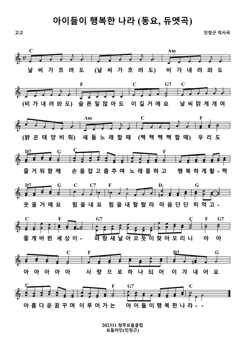 #아이들이행복한나라 #행복한나라 #아이들 #날씨가흐려도 #비가내려와도 #슬픈일많아도 #날씨맑게개여 #밝은태양비춰 #새들노래할때 #짹짹짹짹 #우리도즐거워함께 #손을잡고춤추며 #노래를하고 #행복하게활짝웃을거에요 #힘을내요힘을내 #랄랄라 #마음단단히먹고 #좋게바뀐세상이 #파랑새날아오듯이 #찾아오리니 #파랑새 #사랑으로하나되어 #이겨내어요 #아름다운꿈꾸며이루어가는 #아름다운꿈 #사랑 #평화 #우는아이들 #배고픈아이들 #다친아이들 #죽는아이들 #슬픔없는세상 #가요 #새가요 #찬양 #새찬양 #아이들찬양 #어린이찬양 #창작곡 #연주곡 #요들러민 #민창근 #충만교회 #청주충만교회 #용암동 #노래많이만드는 #노래많이만드는요들러민 #노래많이만드는사람 #청주