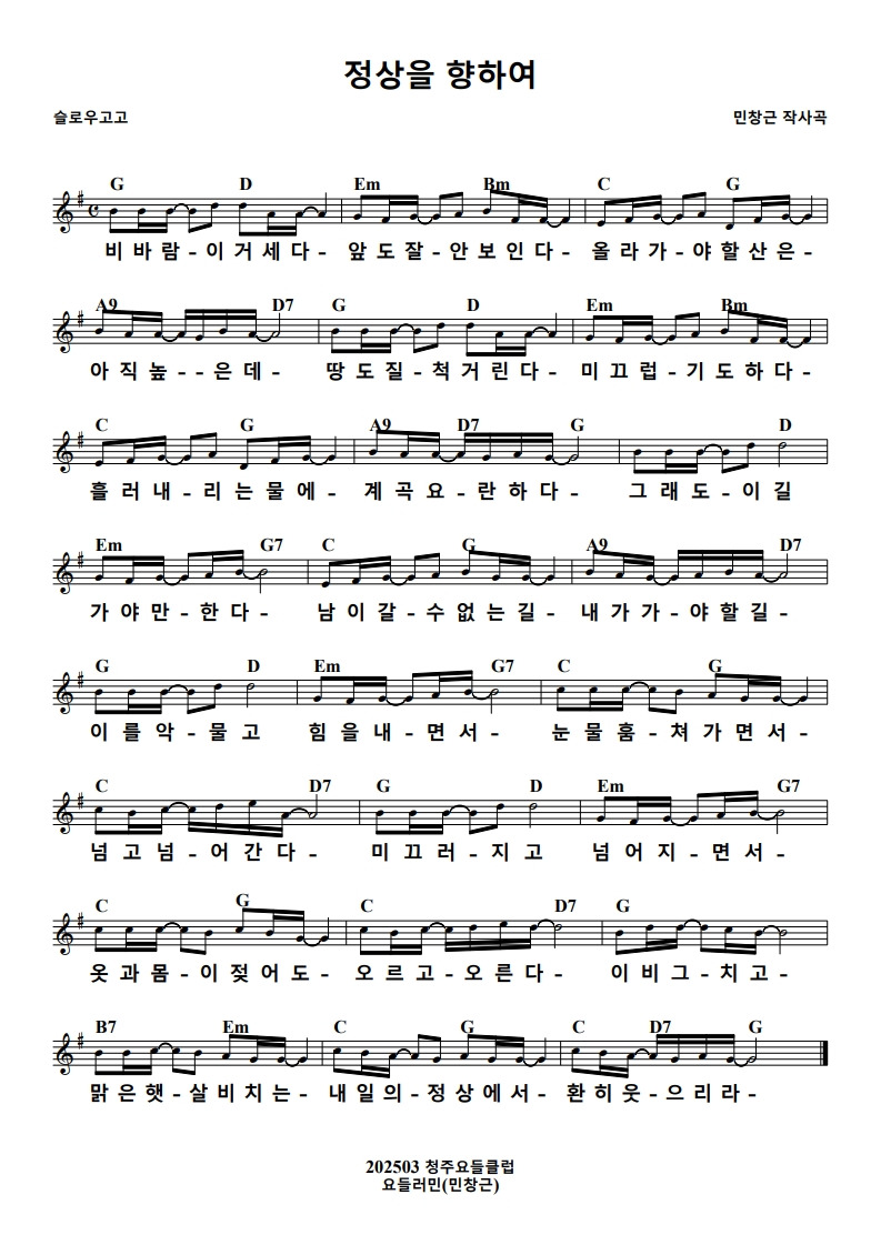 이 비 그 - 치 고 - 맑 은 햇 - 살 비 치 는 - 내 일 의 - 정 상 에 서 - 환 히 웃 - 으 리 라 -
