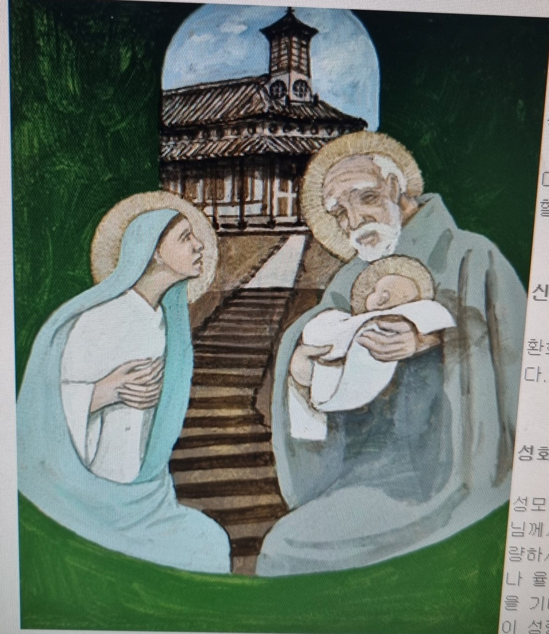 ⑦ 아기의 아버지와 어머니는 아기를 두고 하는 이 말에 놀라워하였다. 시메온은 그들을 축복하고 나서 아기 어머니 마리아에게 말하였다.(성모송)