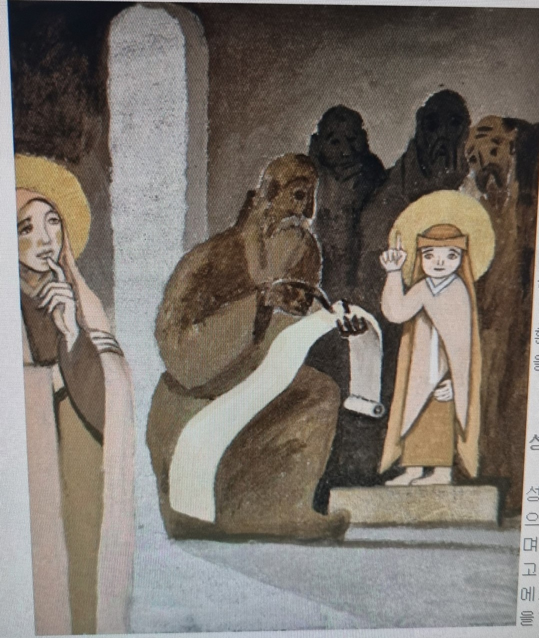 ⑤ 그는 율법 교사들 가운데에 앉아 그들의 말을 듣기도 하고 그들에게 묻기도 하고 있었다. 그의 말을 듣는 이들은 모두 그의 슬기로운 답변에 경탄하였다.(성모송)