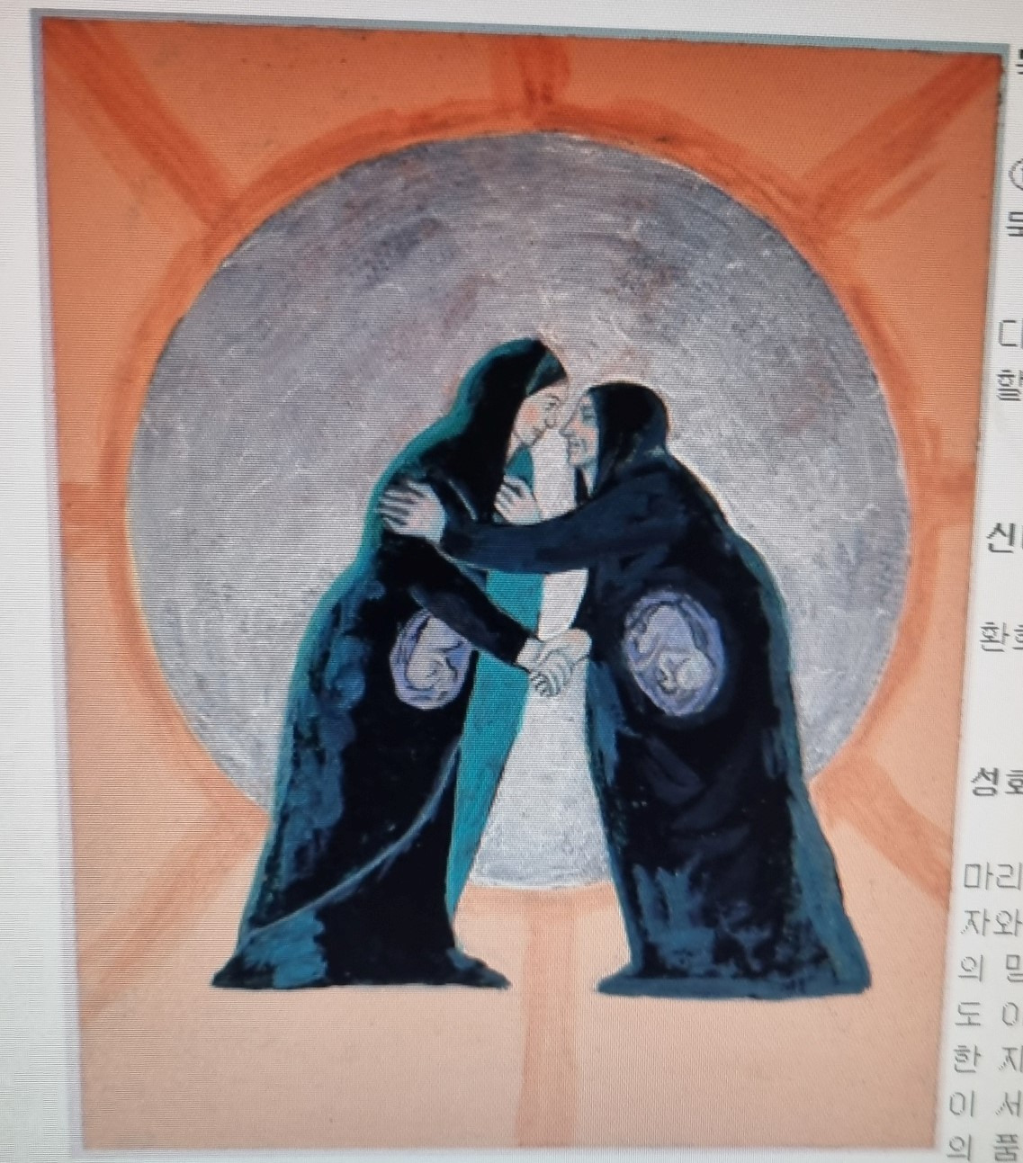 마리아의 태 안에 잉태된 예수님과 엘리사벳 태중의 요한, 인류의 구원자와 빛의 증언자의 만남. 두 분의 만남은 천사의 말을 들은 마리아의 믿음으로 비롯됩니다. “네 친척 엘리사벳을 보아라. 그 늙은 나이에도 아들을 잉태하였다. 아이를 못 낳는 여자라고 불리던 그가 임신한 지 여섯 달이 되었다.”(루카 1,36) 두 분의 맞잡은 손은 믿는 이들이 서로를 알아보는 반가움이며, 배경의 살색은 하느님을 품은 인간의 품을 표현하고, 뻗은 빛살은 성령께서 함께 하심을 드러냅니다. <그림. 정미연 소화데레사>
