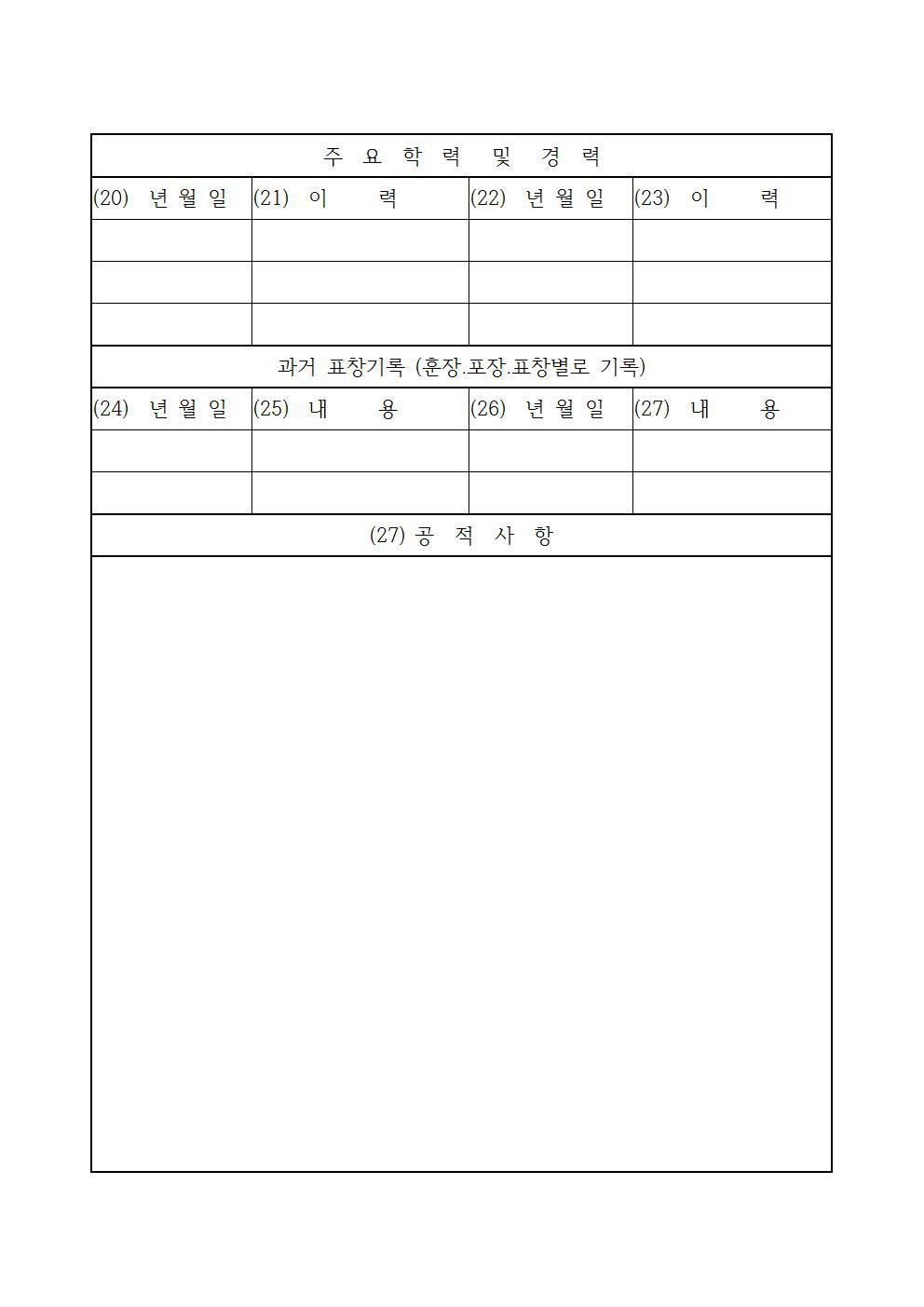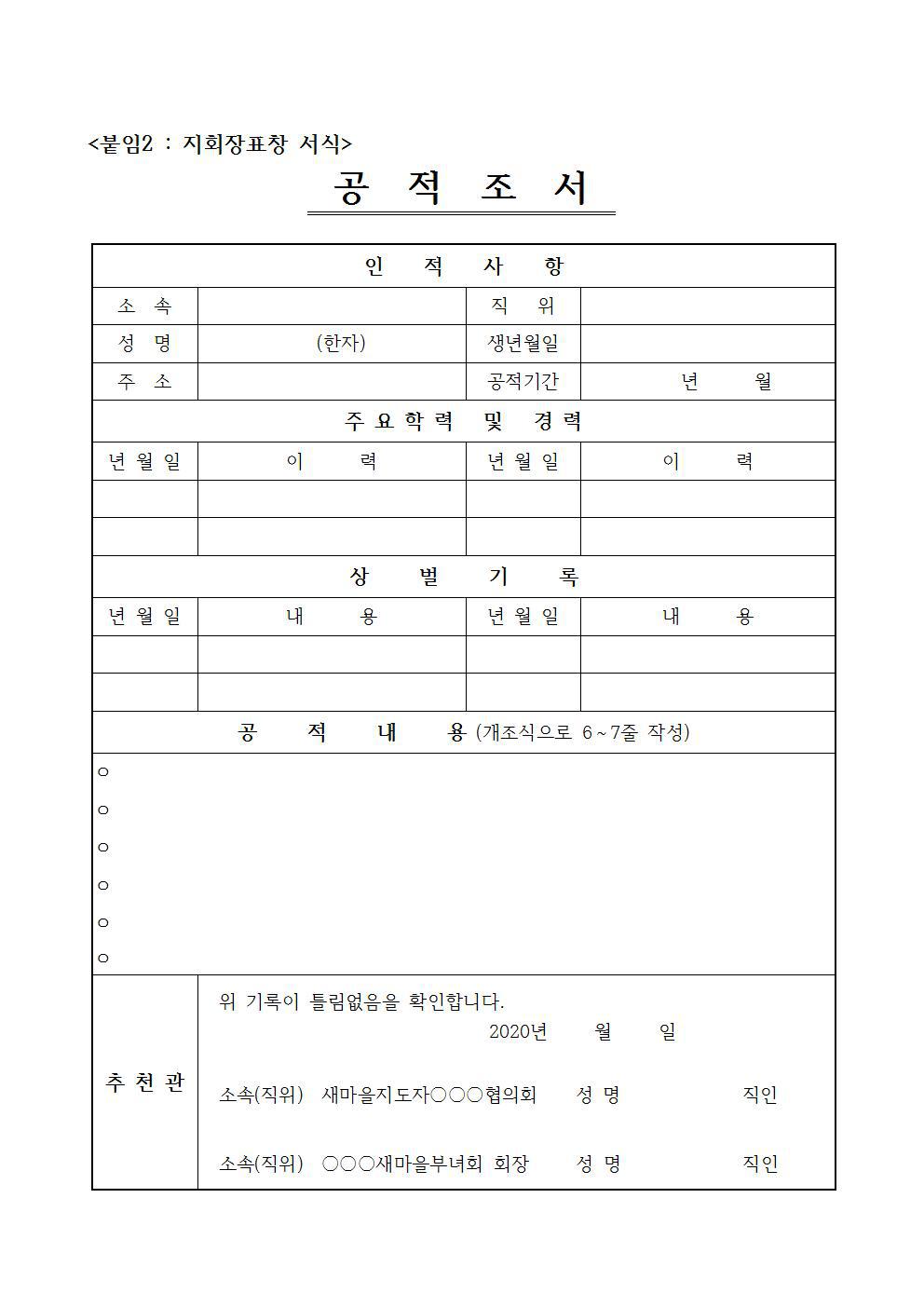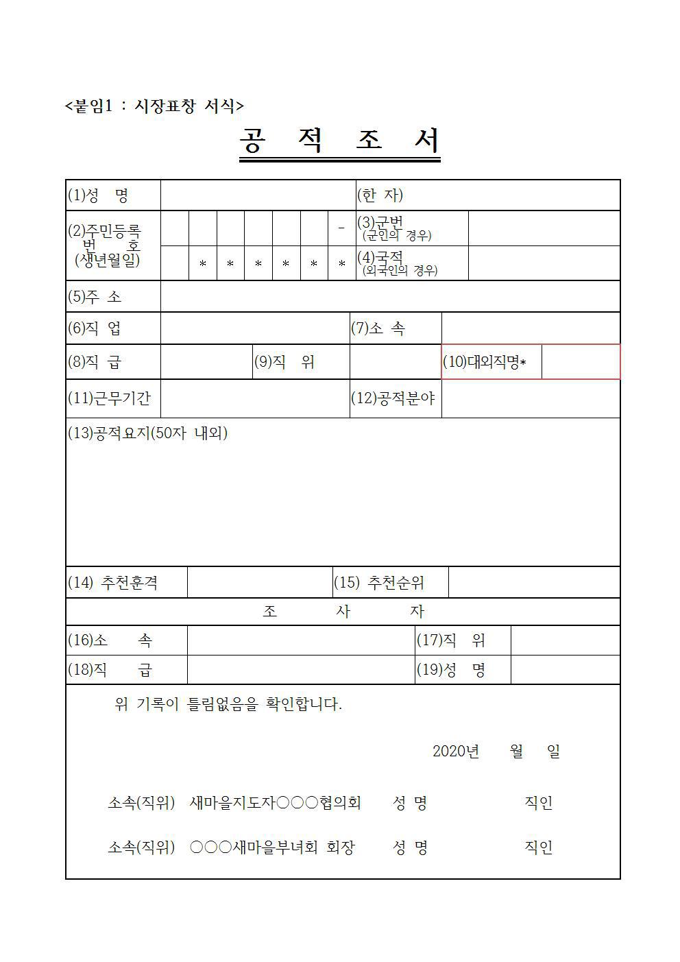 공적조서 양식올림(기념식) 작성자진영|작성시간20.07.29|조회수105 목록 댓글 0 글자크기 작게가 글자크기 크게가 공적조서 양식.hwp 첨부파일첨부된 파일이 6개 있습니다. jpg 파일 공적조서001.jpg 다운로드 jpg 파일 공적조서002.jpg 다운로드 jpg 파일 공적조서003.jpg 다운로드 jpg 파일 공적조서004.jpg 다운로드 jpg 파일 공적조서005.jpg 다운로드 hwp 파일 공적조서 양식.hwp 다운로드 다음검색 현재 게시글 추가 기능 열기 북마크 공유하기 신고 센터로 신고 댓글 댓글 0 댓글쓰기 답글쓰기 댓글 리스트