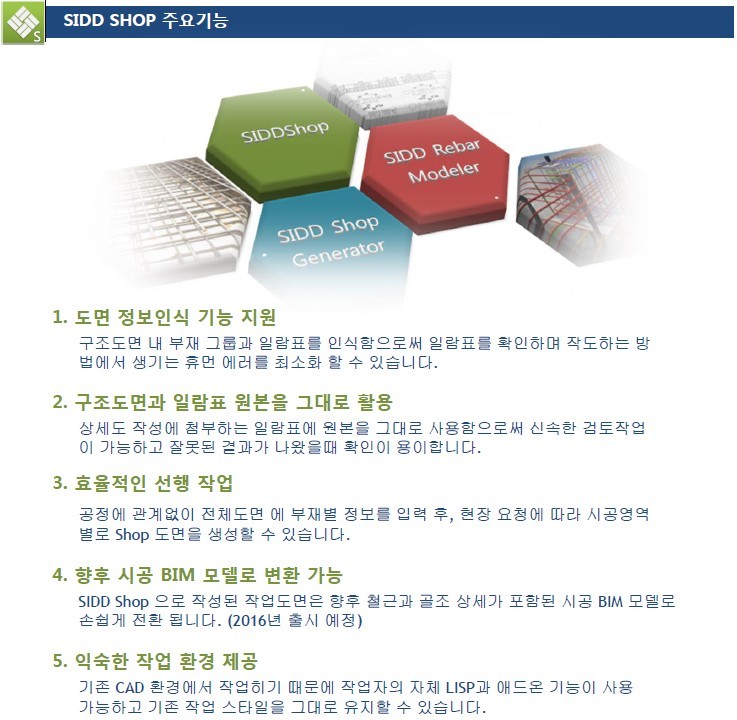 철근 Shop Drawing 제품을 소개합니다. 이미 리바팩토리(RebarFactory)나 SSBar를 사용해 보셨거나 그에 준하는 Shop Drawing 지원툴을 사용해 보셨던 분이시라면 쉽게 사용하실 수 있습니다. Shop 지원 툴을 처음 써 보는 분들도 쉽게 익숙해 질 수 있습니다. 철근 샵 도면은 자주 접하고 작도를 하고 싶은데 직접 작업하기는 어려운 분들을 위해서 샵 드로잉 교육도 실시합니다. 여러 군데 현장을 커버하기 위해 필요한 샵드로잉 제품을 고려하고 있는 반장님들이나 향후 BIM 모델링을 염두에 두고 계신 철근 종사자 분들에게도 도움이 됩니다. 자세한 것은 www.siddsoft.co.kr로 오셔서 확인해 주십시오. 현재 이벤트 기간이기 때문에 좀 더 편안한 선택을 하실 수 있습니다. 궁금하신 점은 jshong@siddsoft.co.kr로 주시면 최대한 자세히 답변 드리겠습니다. 2016년도 쉽지 않은 한 해가 되겠지만 연초에 좋은 선택을 하신다면 기대 이상의 결과를 거둘 수 있습니다. |