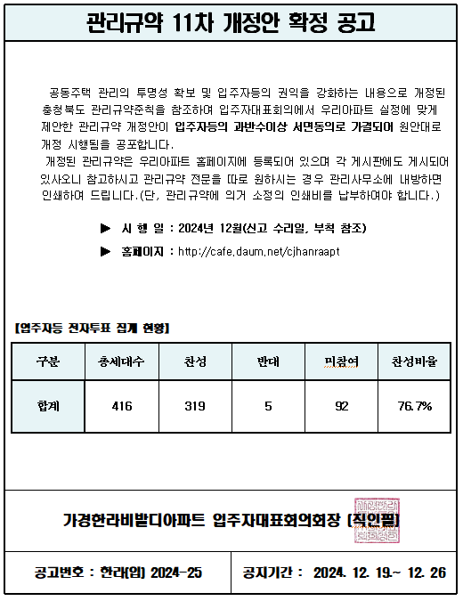관리규약 11차 개정안 확정 공고 작성자가경한라비발디아파트|작성시간24.12.19|조회수13 목록 댓글 0 글자크기 작게가 글자크기 크게가 다음검색 현재 게시글 추가 기능 열기 북마크 공유하기 신고 센터로 신고 댓글 댓글 0 댓글쓰기 답글쓰기 댓글 리스트