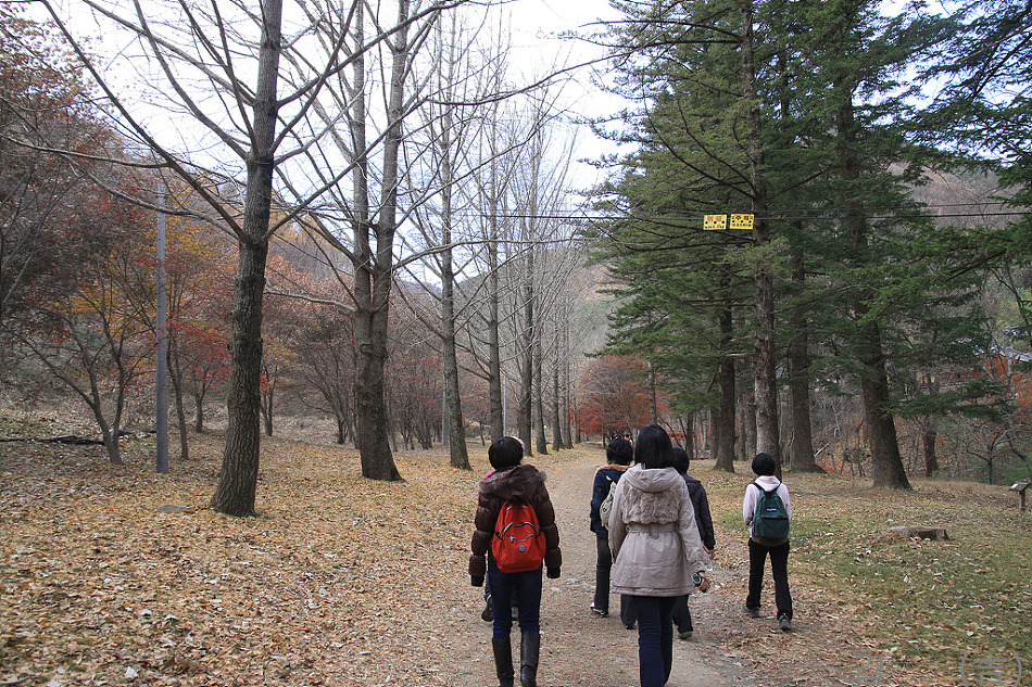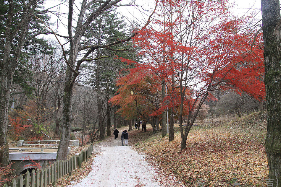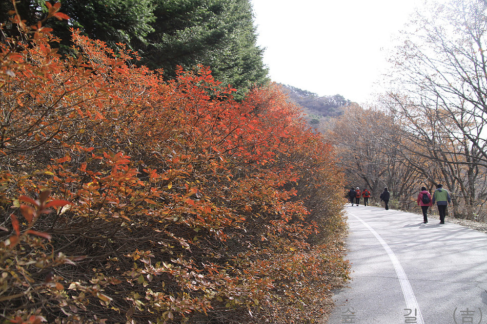 전나무 길이 끝나는 지점에 아직은 떨어지지 않은 단풍이 있어 가을의 정취를 맛보게 해주었다.