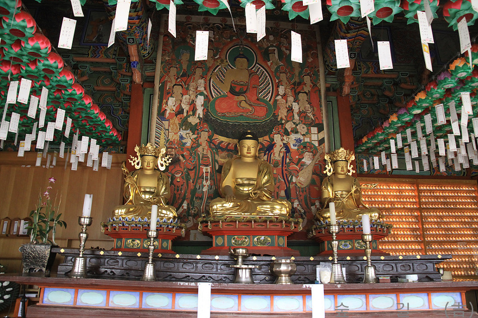 대웅전 삼존불은 석가모니불과 문수보살 그리고 보현보살이라는 것이다.