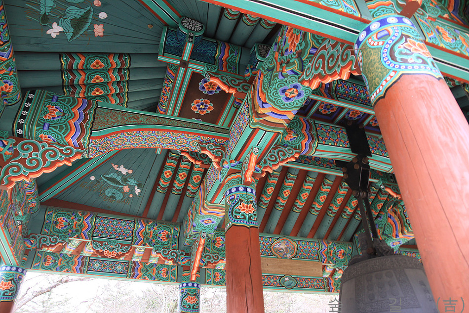 범종루를 보았는데 천정에 연잎과 연꽃이 장식되어 있는 것같이 보였다.