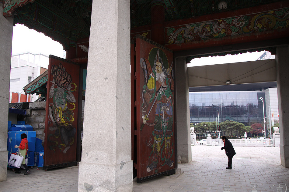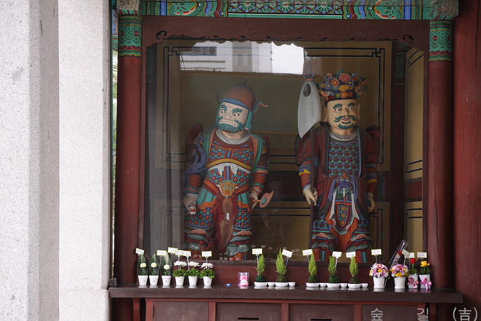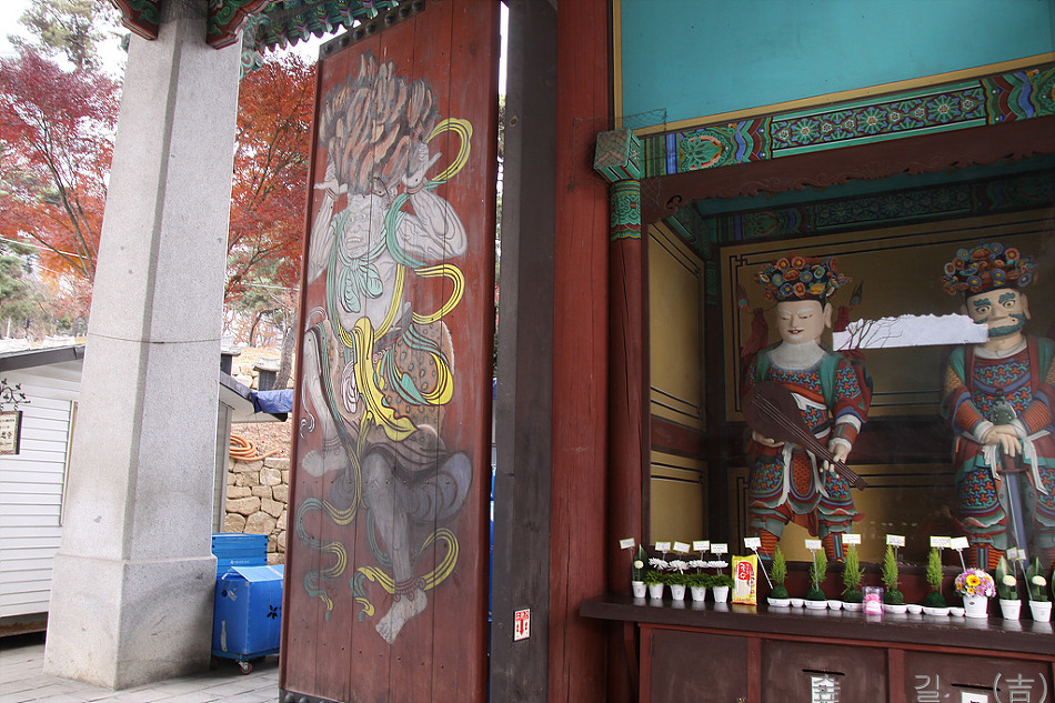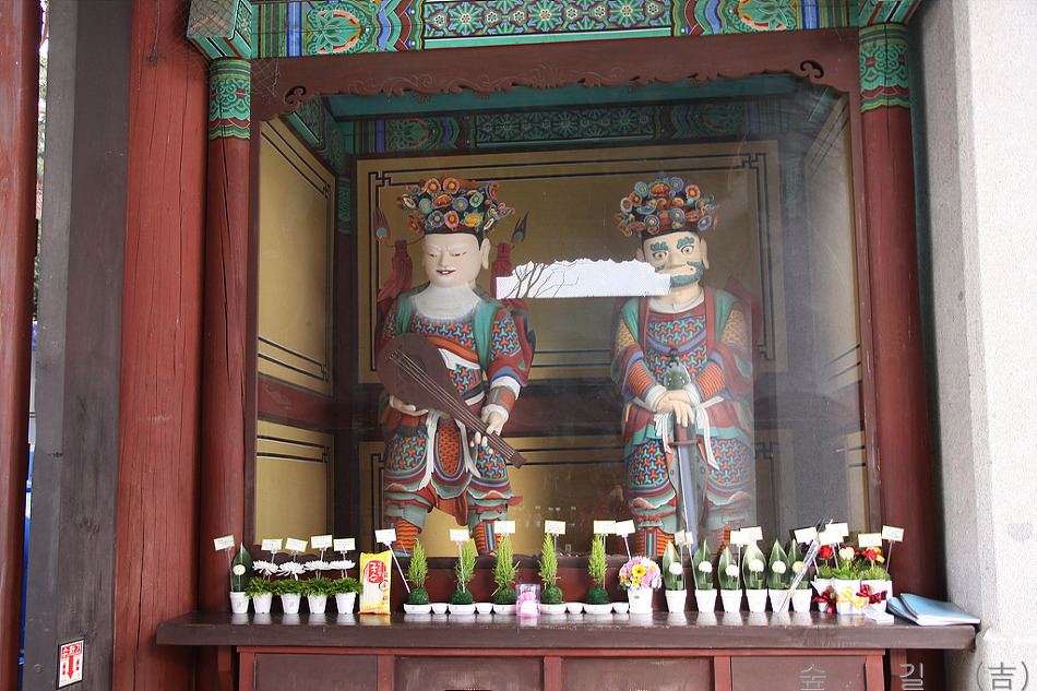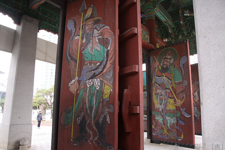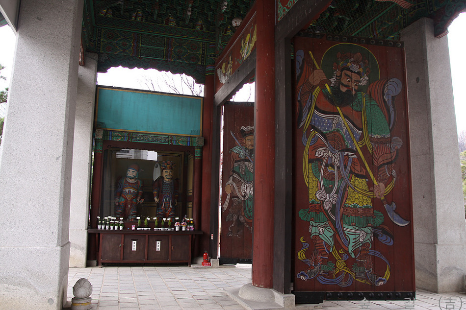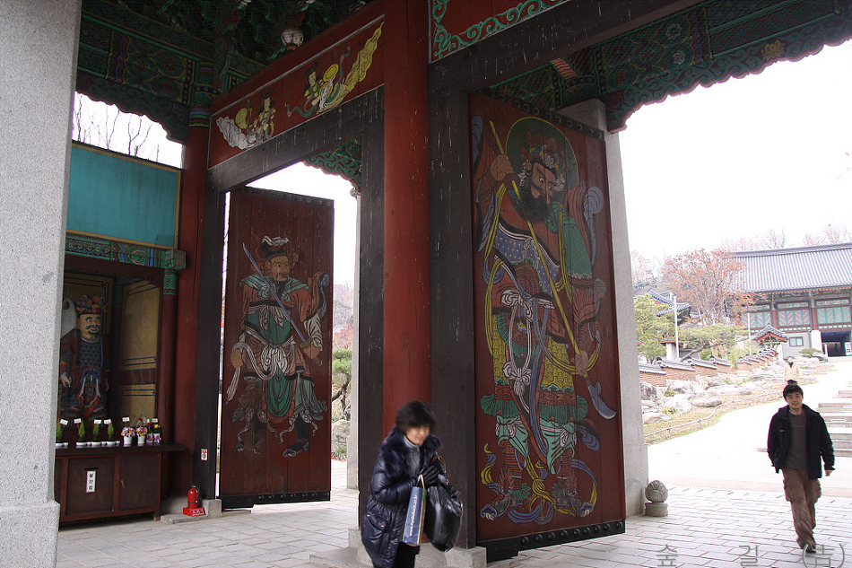 문에 칼을 든 신장과 바위를 든 금강역사가 있다.