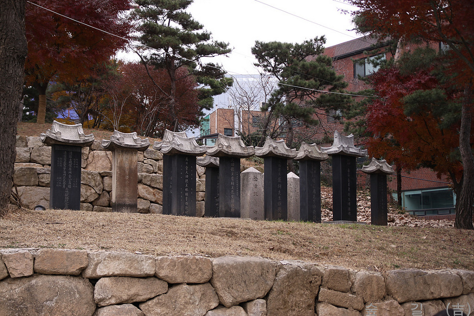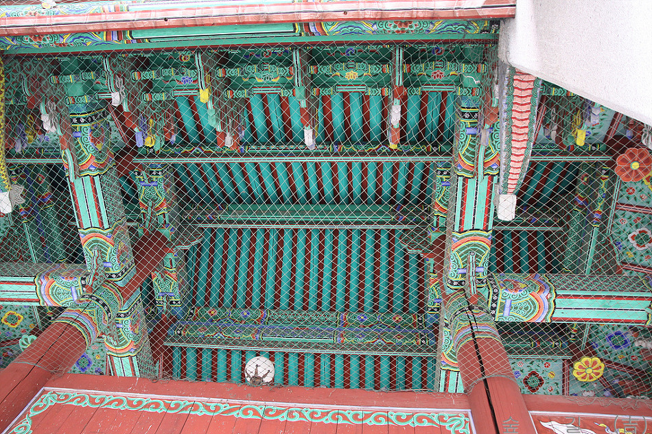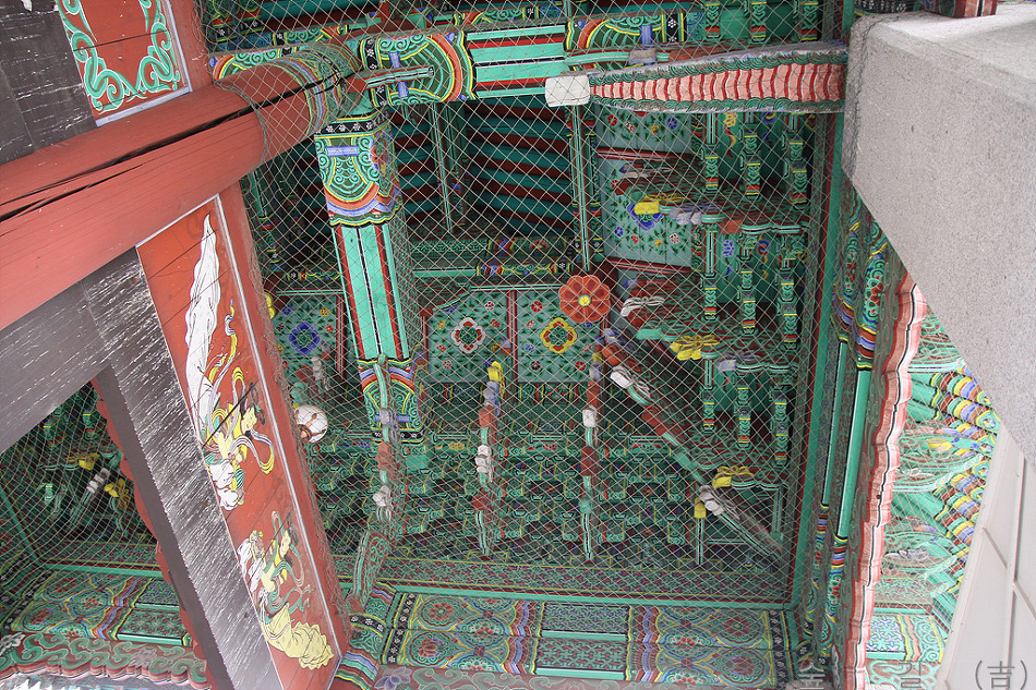 편액 밑의 머리초 단청은 장구머리초인데 장구의 색이 흰색과 칼라로 나누어져 있다.